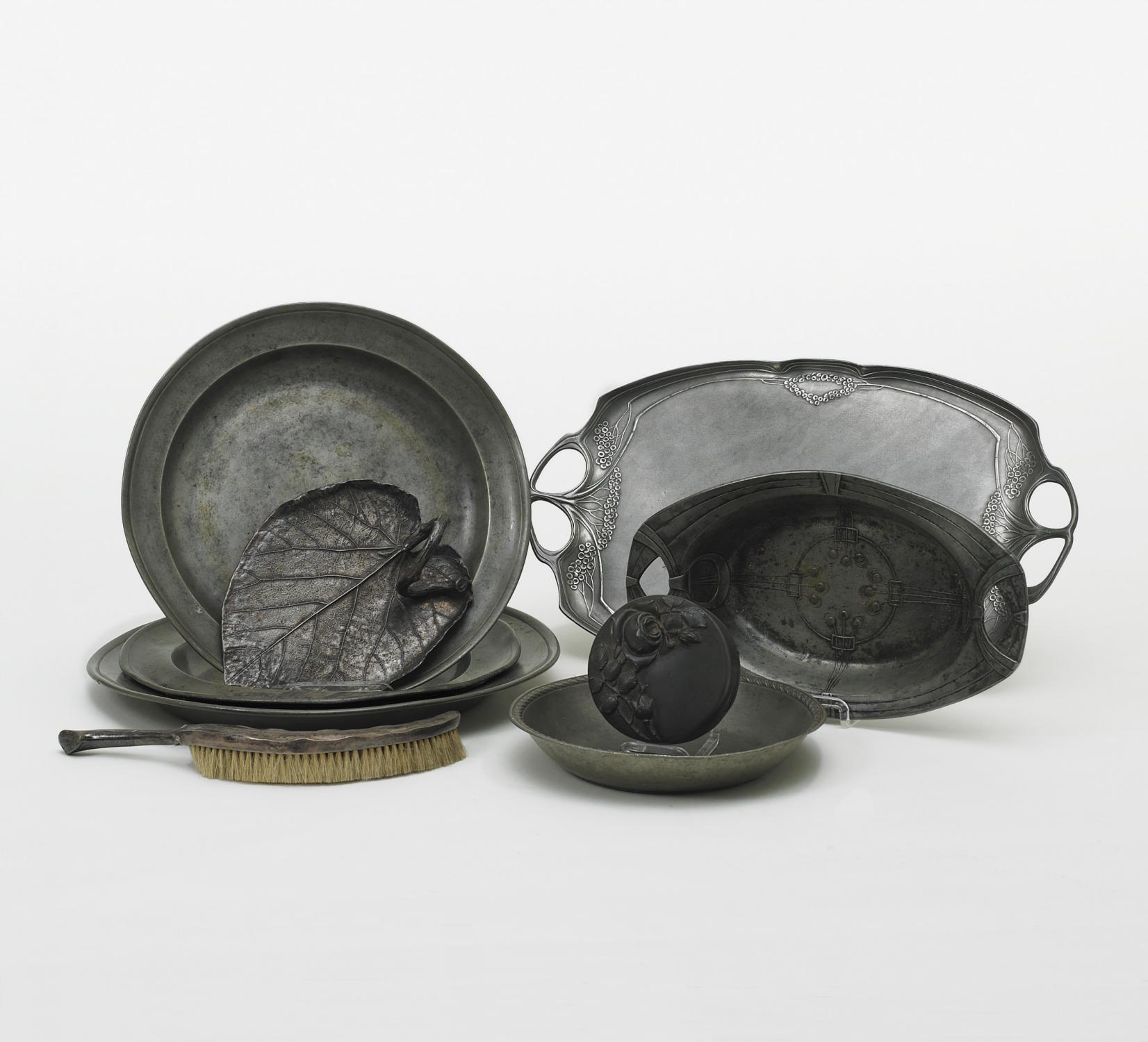 Zinn. Insg. 8 Teile. {Beil.:}Handfeger. Metall versilbert. Zustand A/B.
