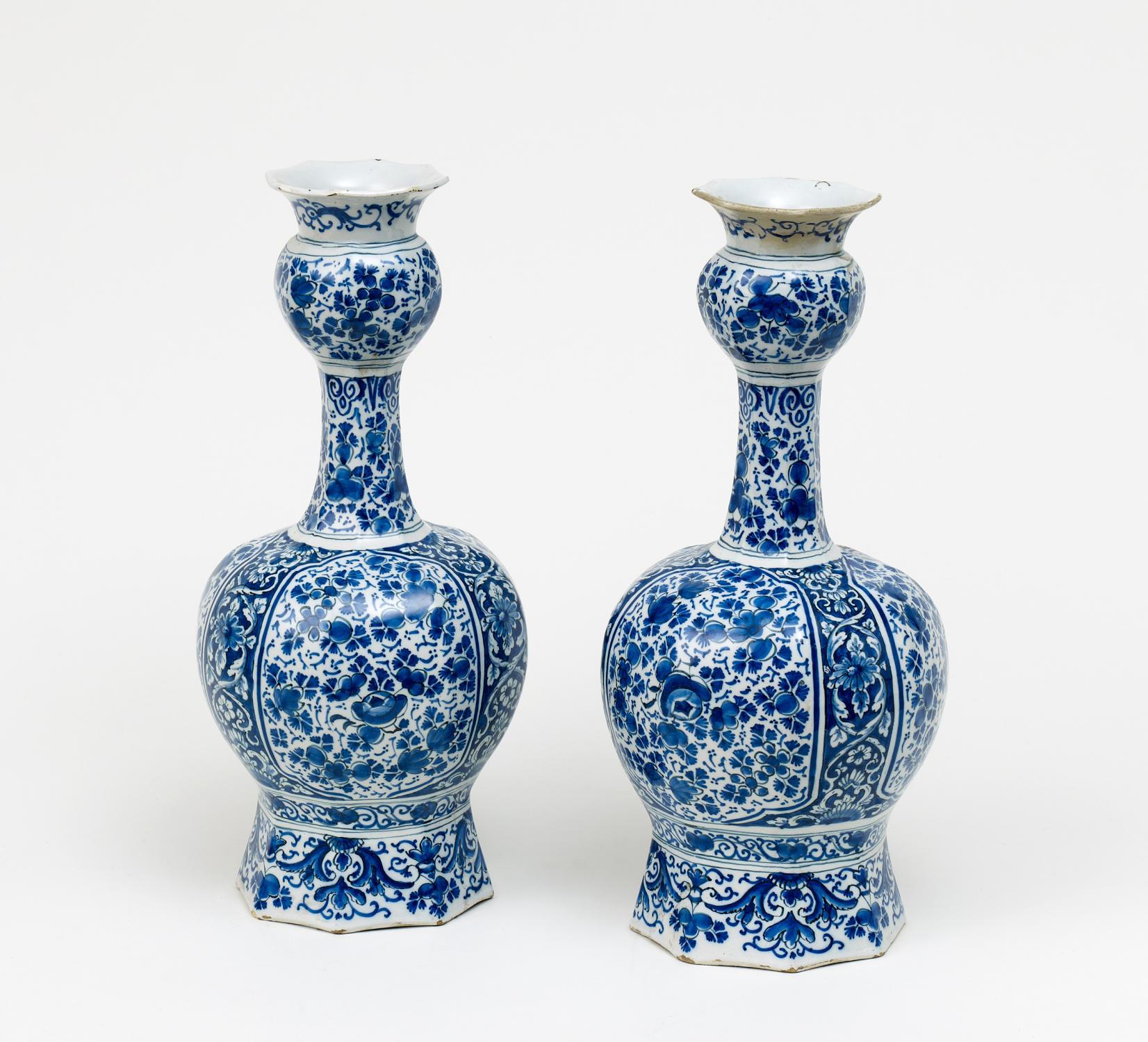 Sandfarbener Scherben, weiß glasiert, blauer Dekor. H.48cm. Zustand B-C.
