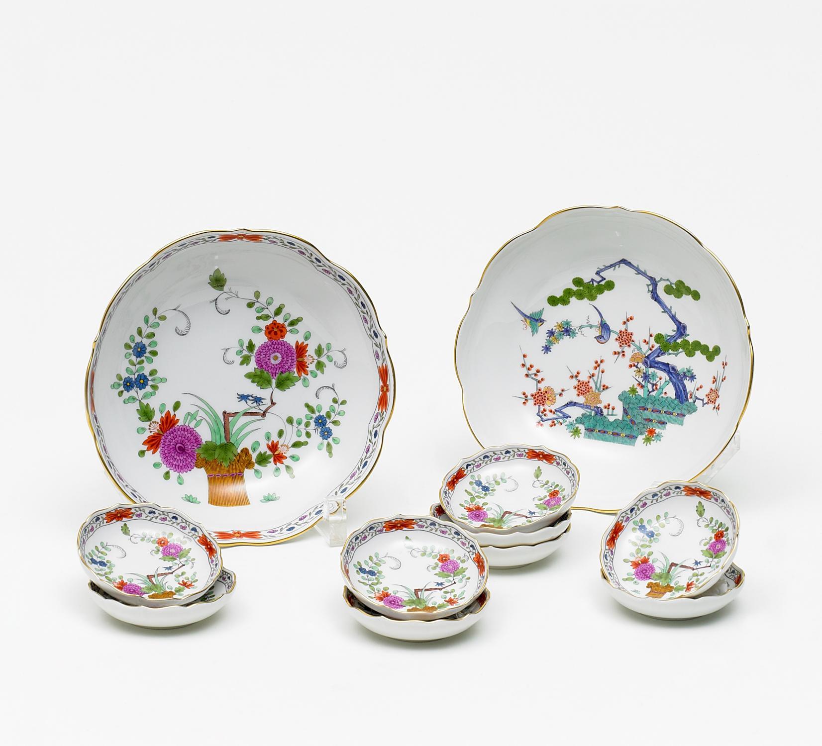 Porzellan, farbig staffiert, Goldrand. 9 kl. und 1 größeres Schälchen. {Beil.:} Schälchen. 'Drei Freunde'. + 8/17,5cm. Zustand A.