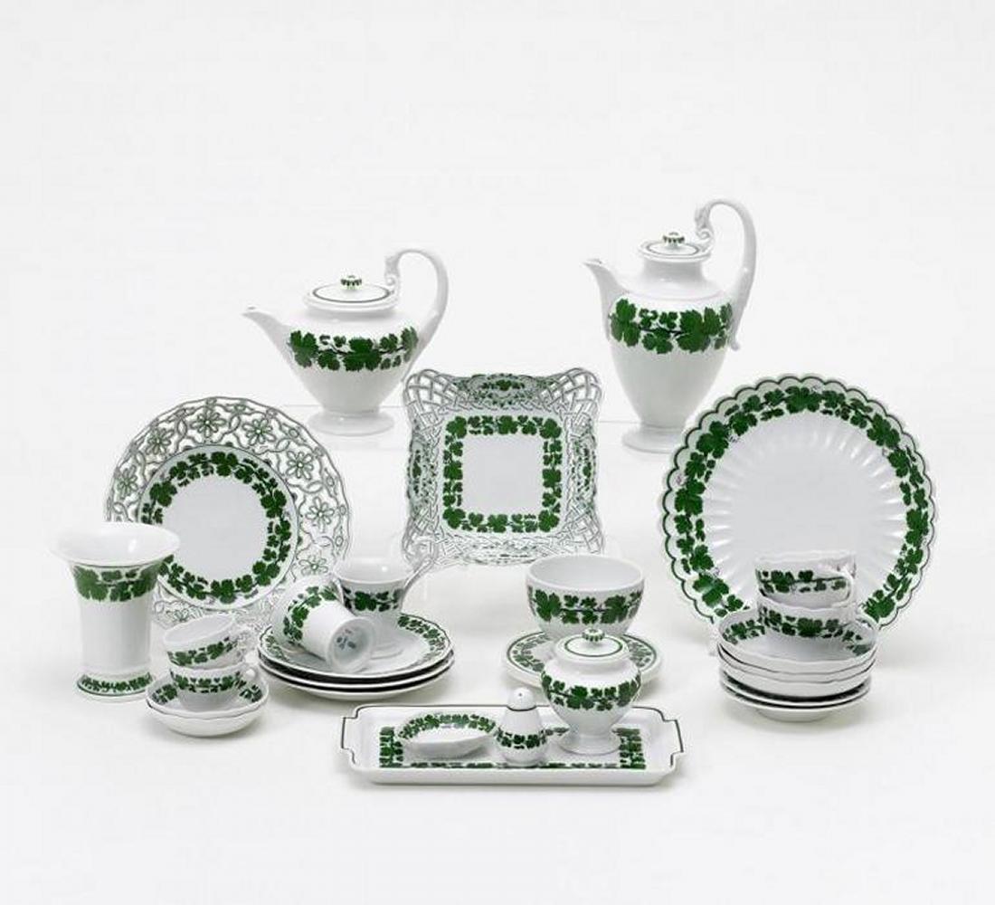 Porzellan, grünes Dekor. Insg. 56 Teile. Best. aus 8 Kaffeetassen, 8 UT, 6 Teetassen, 6 UT, 2 Mokkatassen, 2 UT, 8