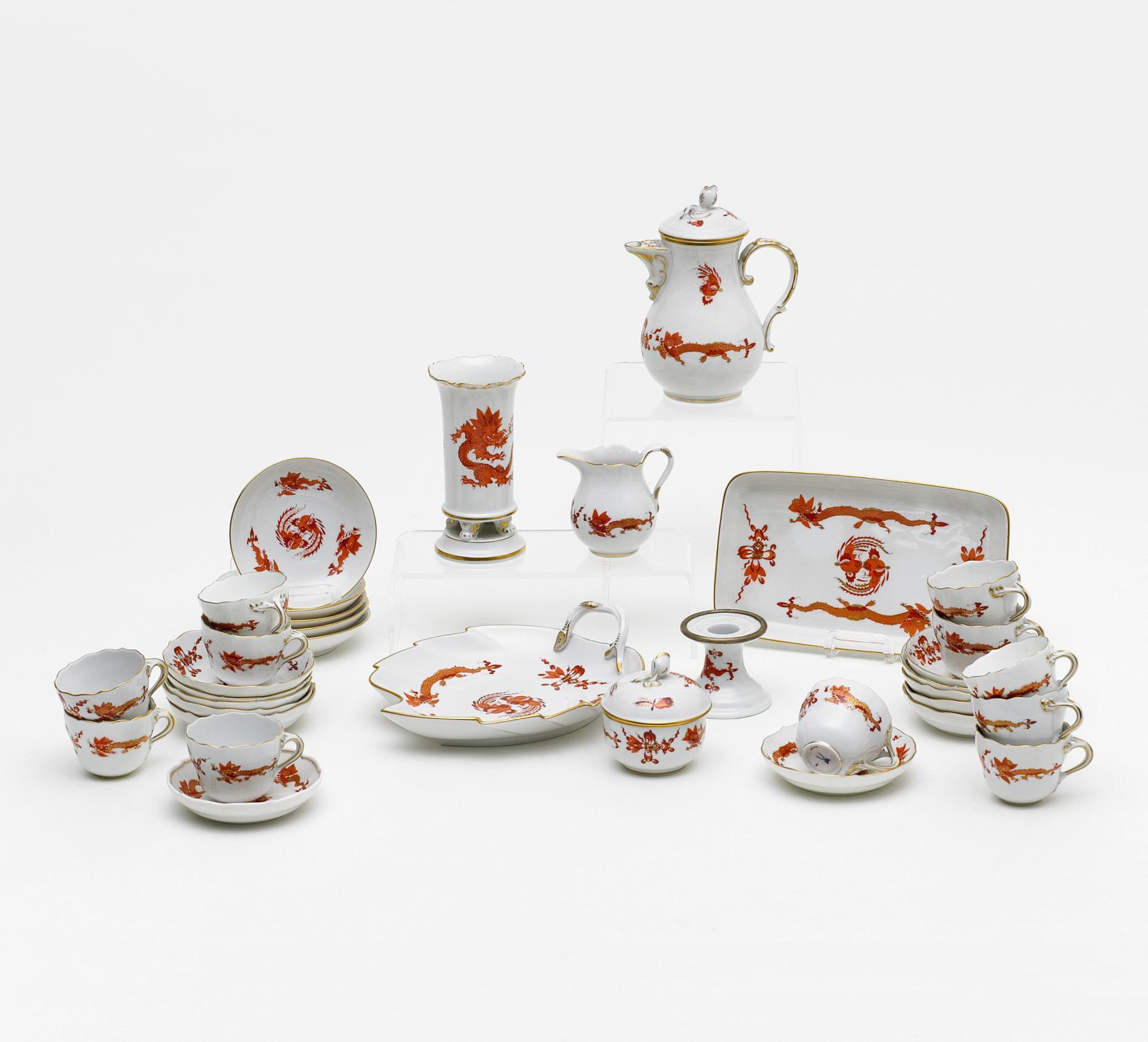 Porzellan, eisenrot und gold staffiert. 11 Personen. Insg. 34 Teile. Best. aus 11 Tassen, 17 UT, Milchgießer, Zuckerschale,