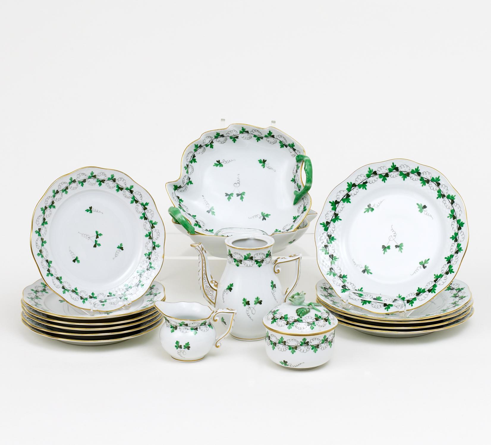 Porzellan, grünes Dekor. Goldrand. Insg. 16 Teile. Best. aus kleiner Teekanne ohne Deckel, Milchgießer und Zuckerdose, 5