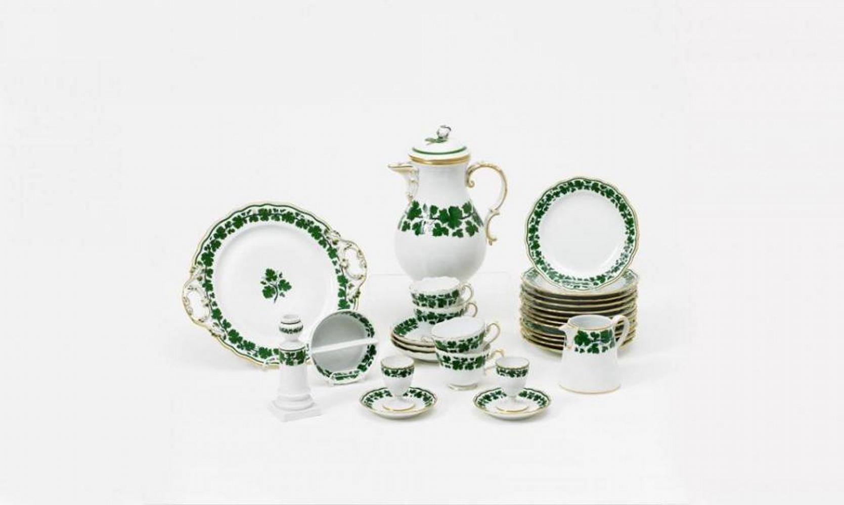 Porzellan, grünes Dekor, gold staffiert. 12 Personen. Insg. 49 Teile. Best. aus 1 Kanne, 2 Eierbechern, 12 Desserttellern, 12