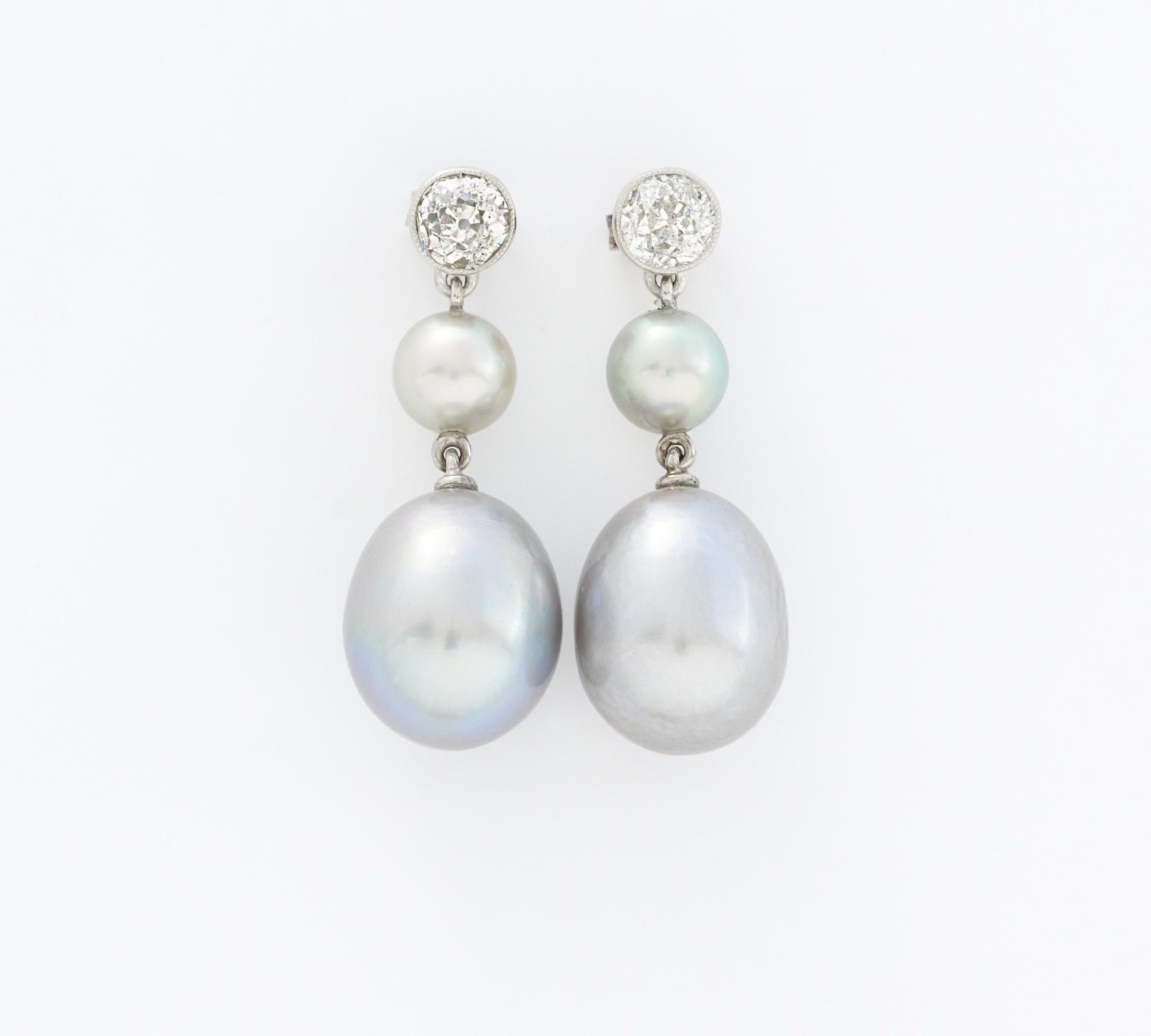 750/- Weißgold, Gewicht: 5,2g. 2 Altschliff-Diamanten zus.ca. 0,695ct TCr(I) P1, 2 Süßwasser-Zuchtperlen D.ca. 6mm, grau-grünlich, 2 Süßwasser-Zuchtperl Tropfen D.ca. 12,50mm, hellgrau-anthrazit,