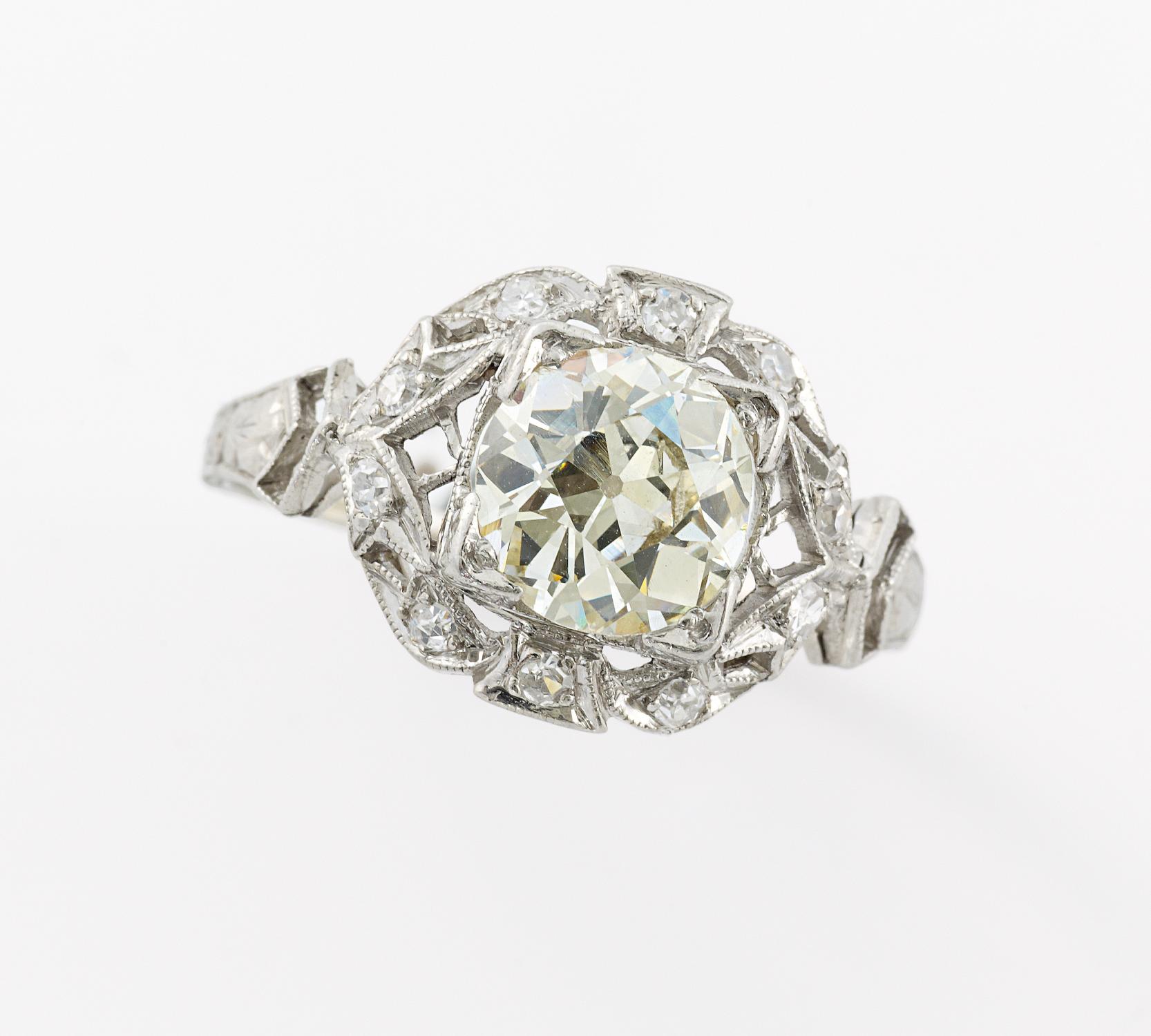 900/- Platin, Gewicht: 3,8g. 1 Altschliff-Diamant ca. 1,346ct TCape(L) VS2, 10 Diamanten im 8/8- und Altschliff zus.ca. 0,081ct, EU-RM: 55. Altschliff-Diamant mit Kerbe an Rundiste, Diamant sitzt locker.