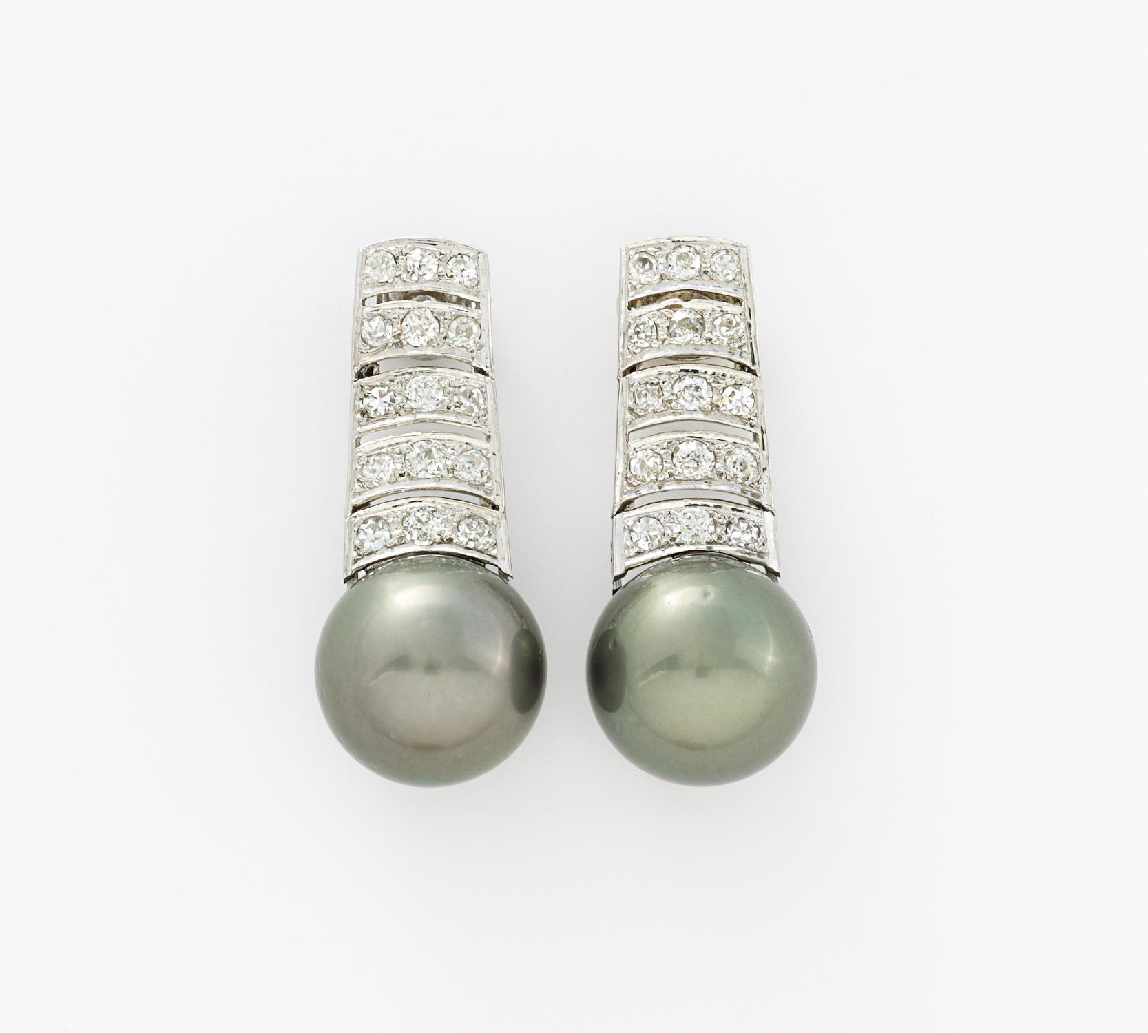 750/- Weißgold, 950/- Platin, Gewicht: 6,0g. 30 winzige Diamanten im Alt- und 8/8-Schliff zus.ca. 0,275ct, 2 Tahiti-Zuchtperlen D. 11mm, dunkelgrau-anthrazit,
