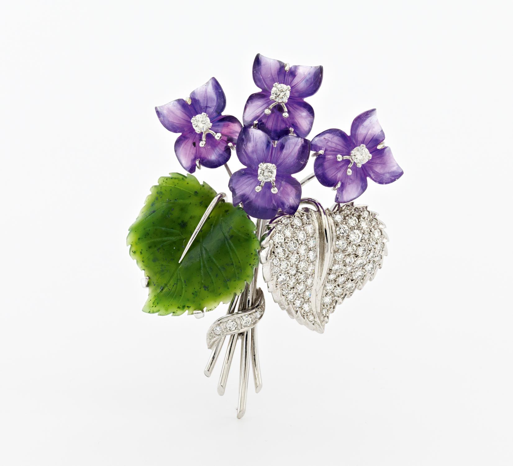 585/- Weißgold, Gewicht: 22,2g. 4 gravierte Amethystblüten, 1 graviertes Nephritblatt, 68 Brillanten zus.ca. 1,448ct TW(F-G) IF-VVS, H x B=5,8 x 4,3cm. Innseitig gestempelt "R".