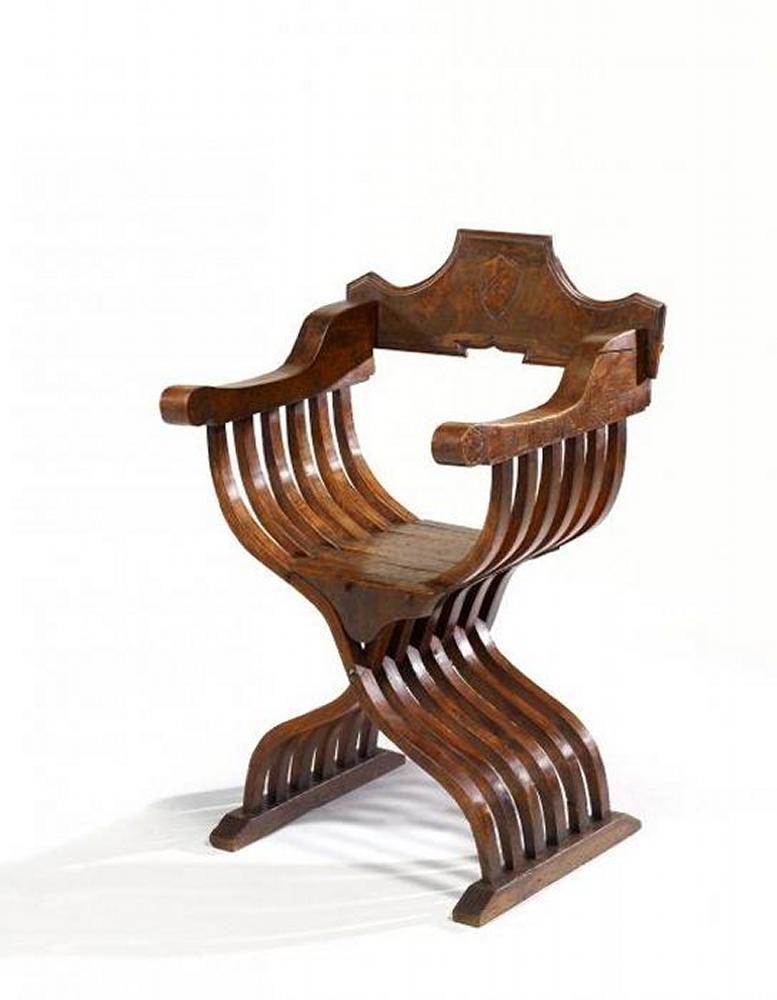 Eiche geschnitzt. Klappbares Scherengestell mit geometrischem und floralem Dekor. Wappen auf Lehne. Höhe 103cm. Zustand C.