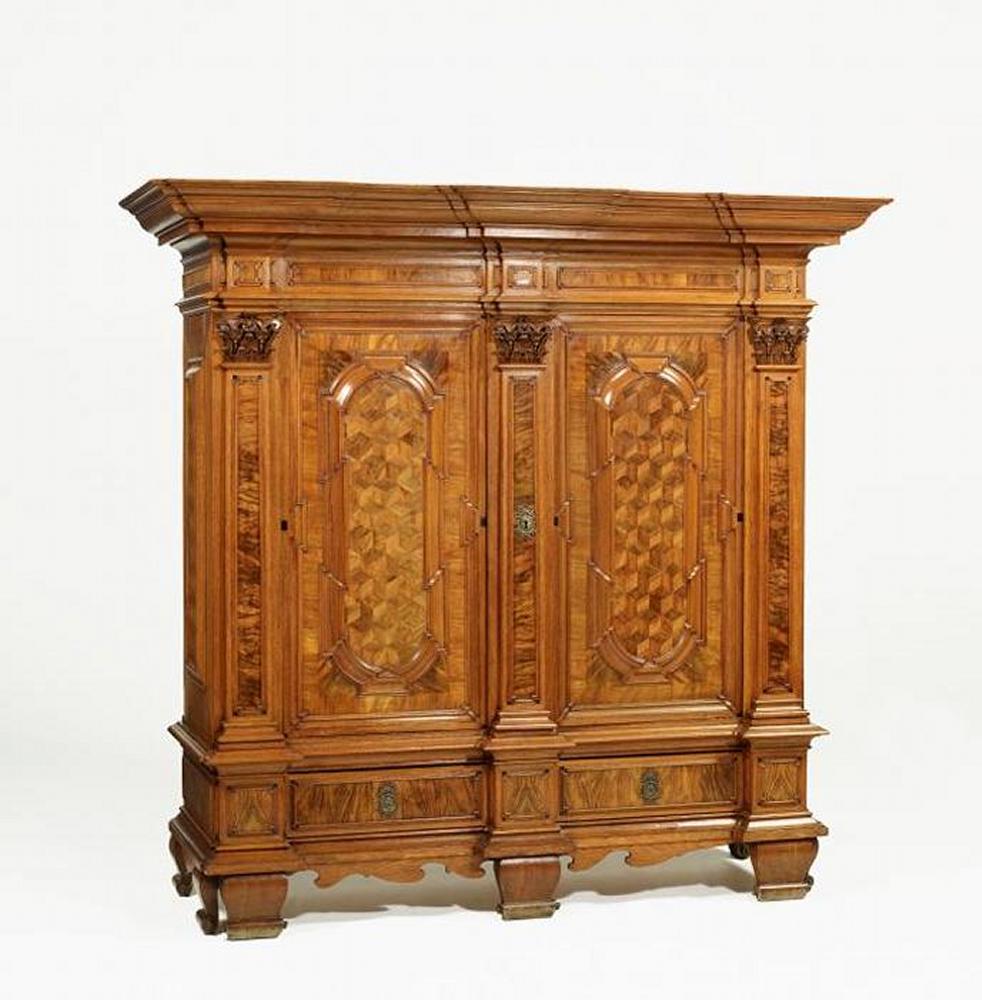 korinthischen Säulenpilastern. In Feldern Würfeleinlagen. 220x200x80cm. Zustand B.