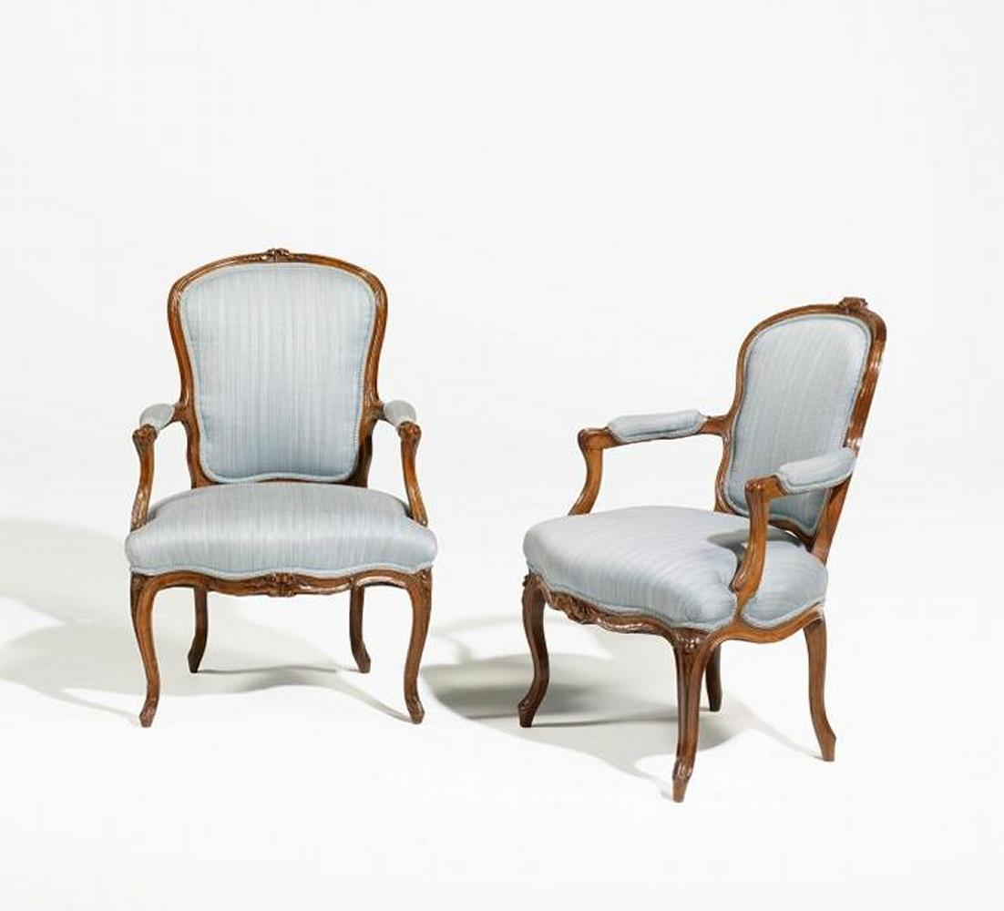 Nussbaum geschnitzt. Gepolstert. Geschweiftes Gestell. Höhe je 88cm. Zustand B.