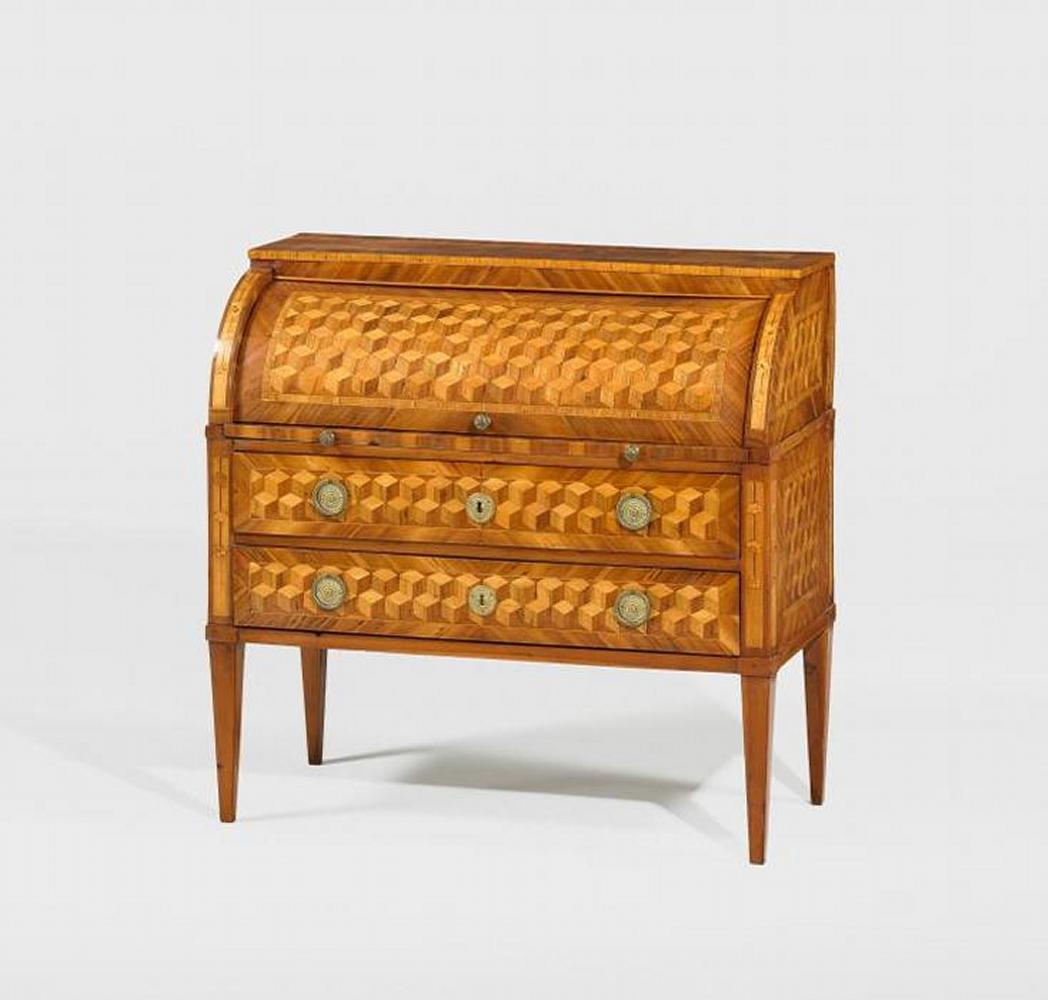 Nussbaum, Ahorn, Kirschbaum. Gerades Gestell auf hohen Vierkantbeinen mit zwei Schüben. Darüber versenkbarer Zylinder