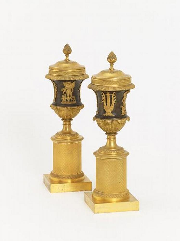 Bronze vergoldet und tlw. patiniert. Quadratische Sockelplinthe, darauf rundes Postament mit guillochiertem Dekor.