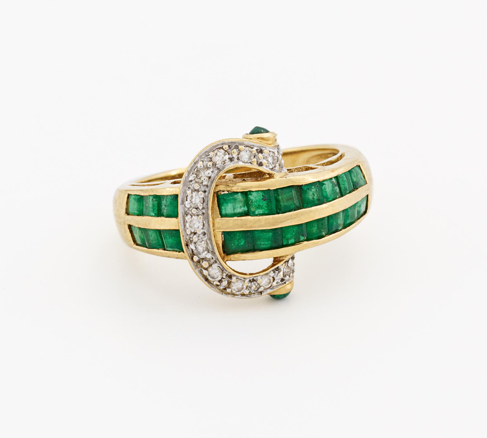 750/- Gelbgold, gestempelt, Gewicht: 3,8g. 2 Smaragd-Cabochons, 20 facettierte Smaragd-Karrees, 12 winzige Brillanten, EU-RM: 53. Ringtop: H x B=1,3 x 2,0cm.