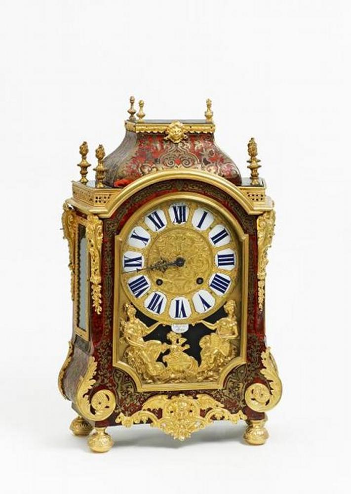 Akanthusblattvoluten. Das ornamental verzierte Zifferblatt von Allegorien getragen.