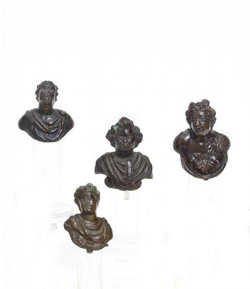 Bronze. Zwei weibliche und zwei männliche Büsten in antiker Gewandung. Höhe 10 bis 12,5cm. Zustand B. Auf Plexisständern.
