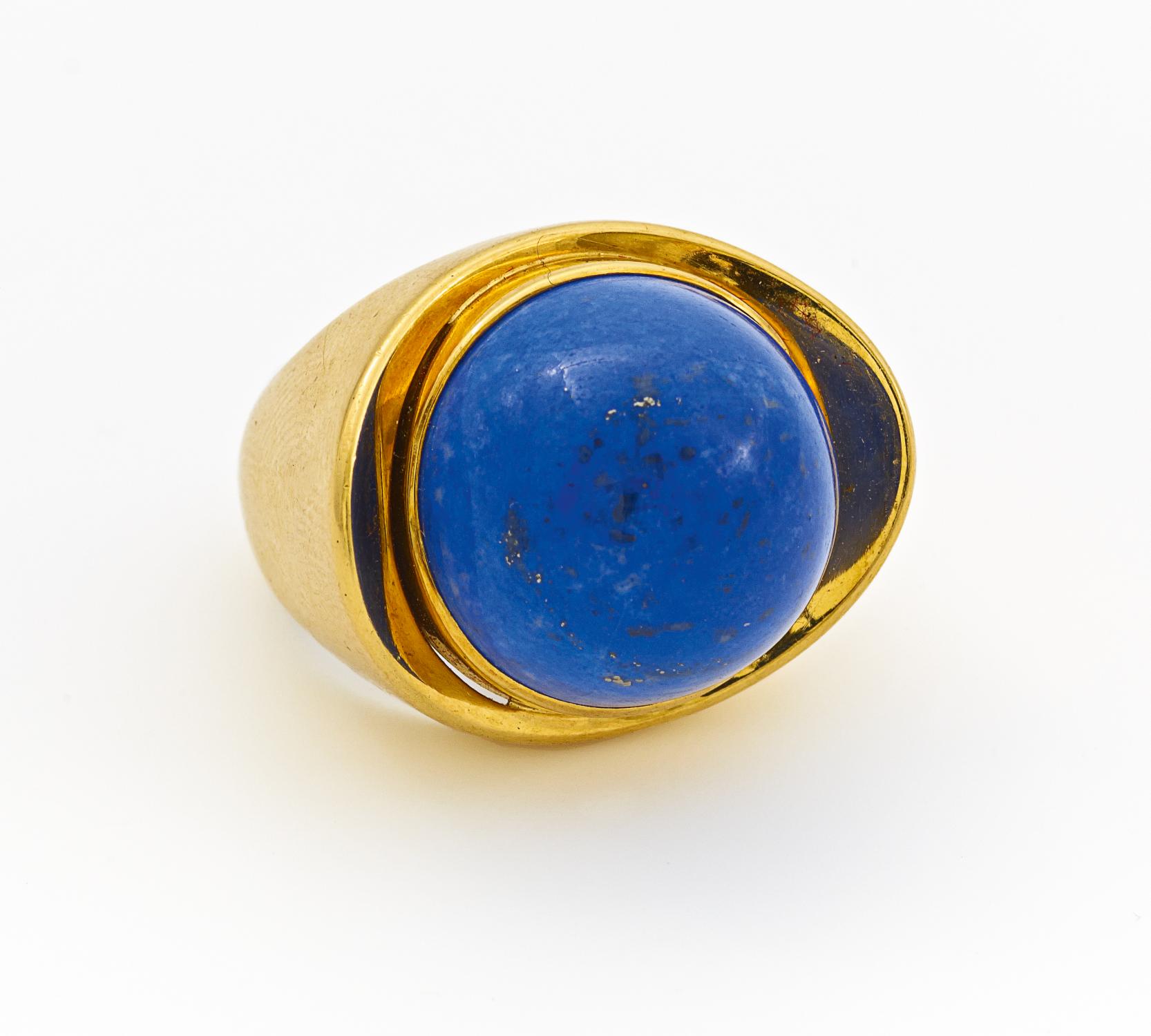 750/- Gelbgold, Gewicht: 22,5g. 1 Lapislazuli-Cabochon D. 17,58x17,22x11,94mm, EU-RM: 52. Innseitig Verkleinerungsschiene aus Metall.