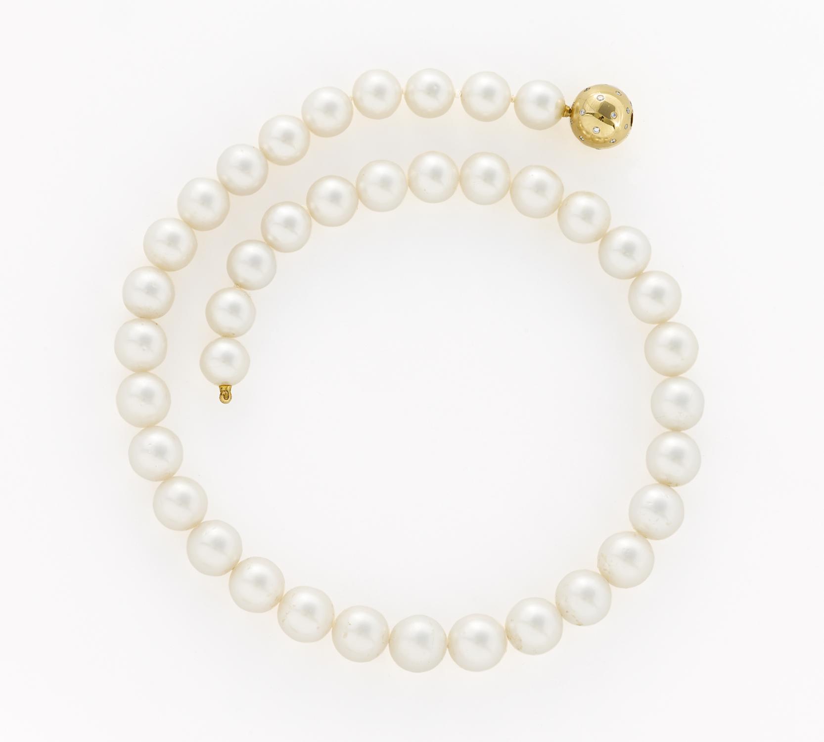 Bajonettverschluß: 750/- Gelbgold, Gewicht: 73,2g. Ca. 32 winzige Brillanten zus.ca. 0,096ct, 39 Südsee-Zuchtperlen, weiß-silbrig, D. 11,40-10,05mm,