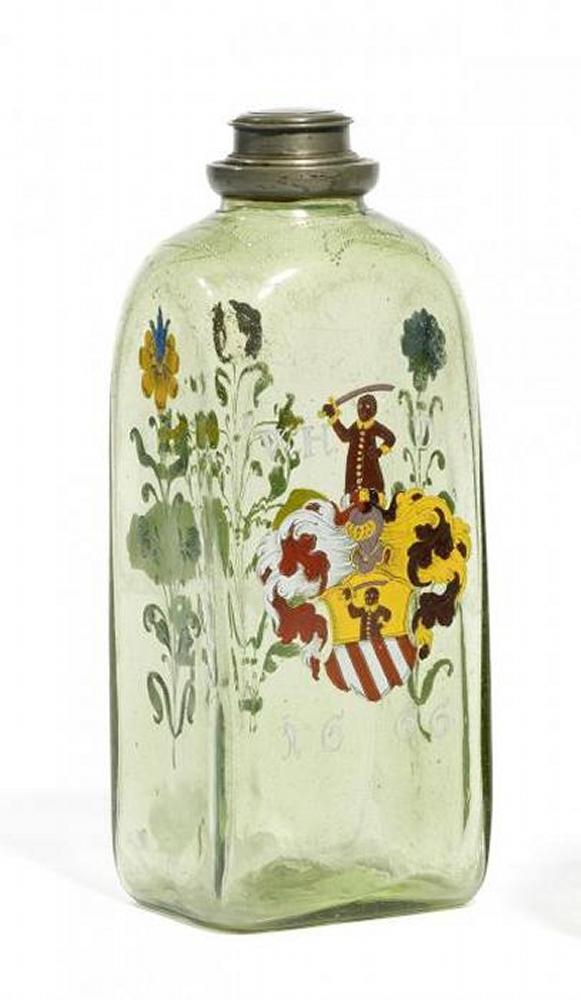 Waldgrünes Glas mit polychromem Emaildekor. Zinnschraubverschluss. Auf Schauseite Wappen mit Helmzier und Mohr mit Säbel. Darunter Jahreszahl 1666, darüber