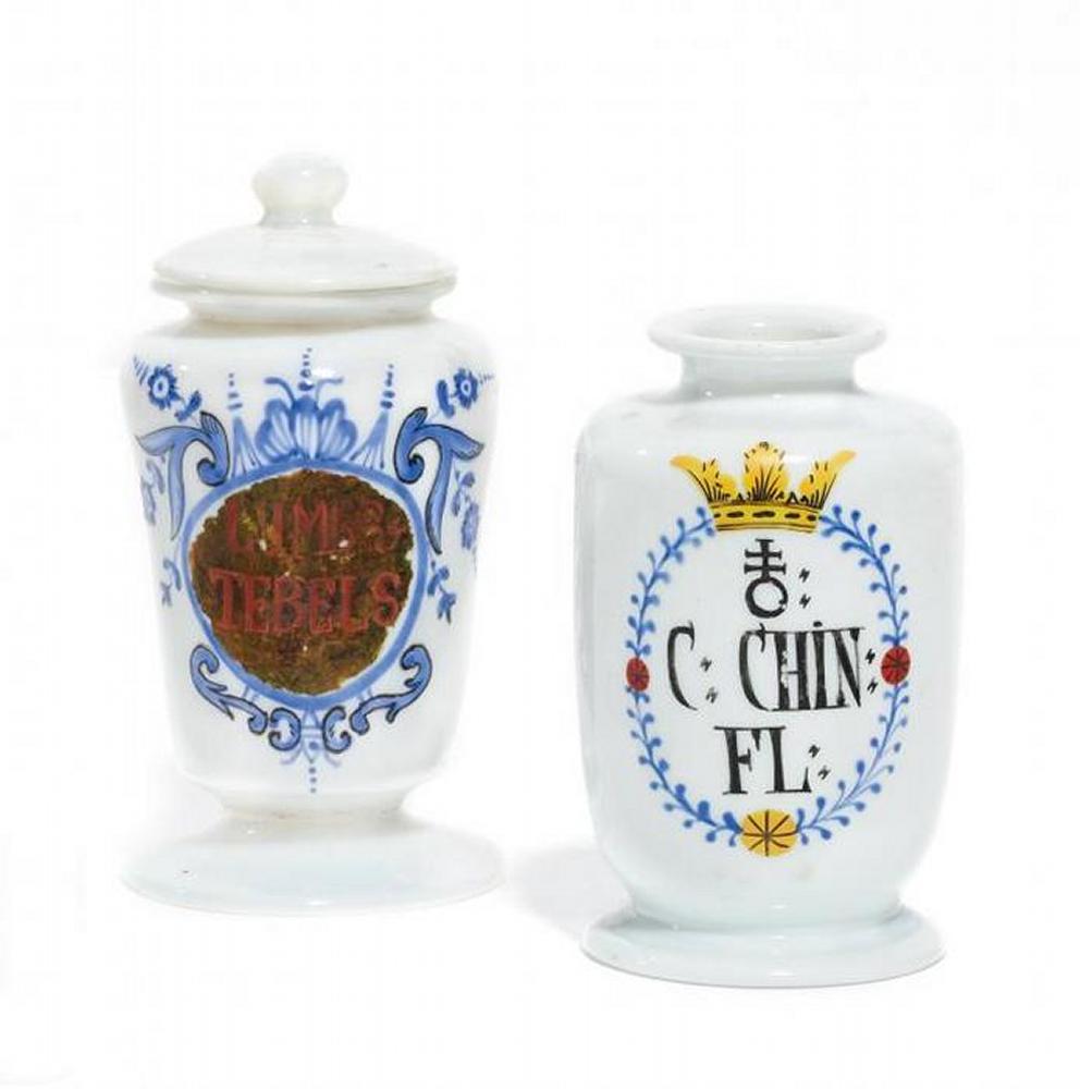 Milchglas mit polychromem Emaildekor. Einmal mit Kaltbemalung. a) Rundes Standgefäß mit Blattkartusche und Krone. Bez.: '(PULVIS)C:CHIN:FL'.