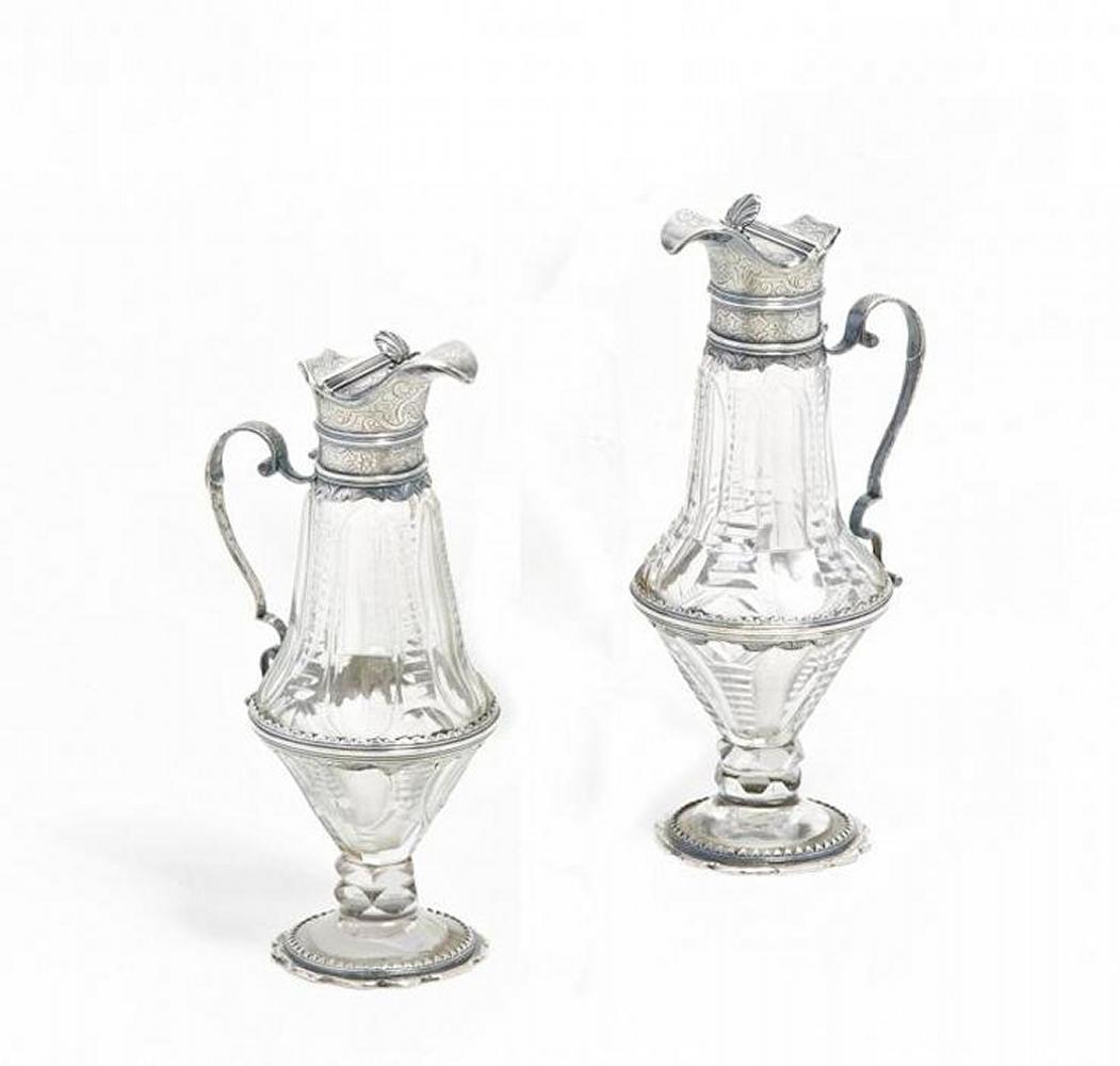 Silber. Kristallglas mit Schliffdekor. Passiger Rundfuß mit birnförmigem Korpus. Die Silbermontierung mit ornamentalem