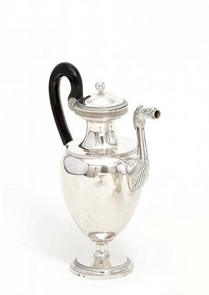 Silber. Ebonisierter Holzhenkel. Auf ansteigendem Rundfuß ovoider Korpus mit abgesetzter Schulter. Der Ohrhenkel auf
