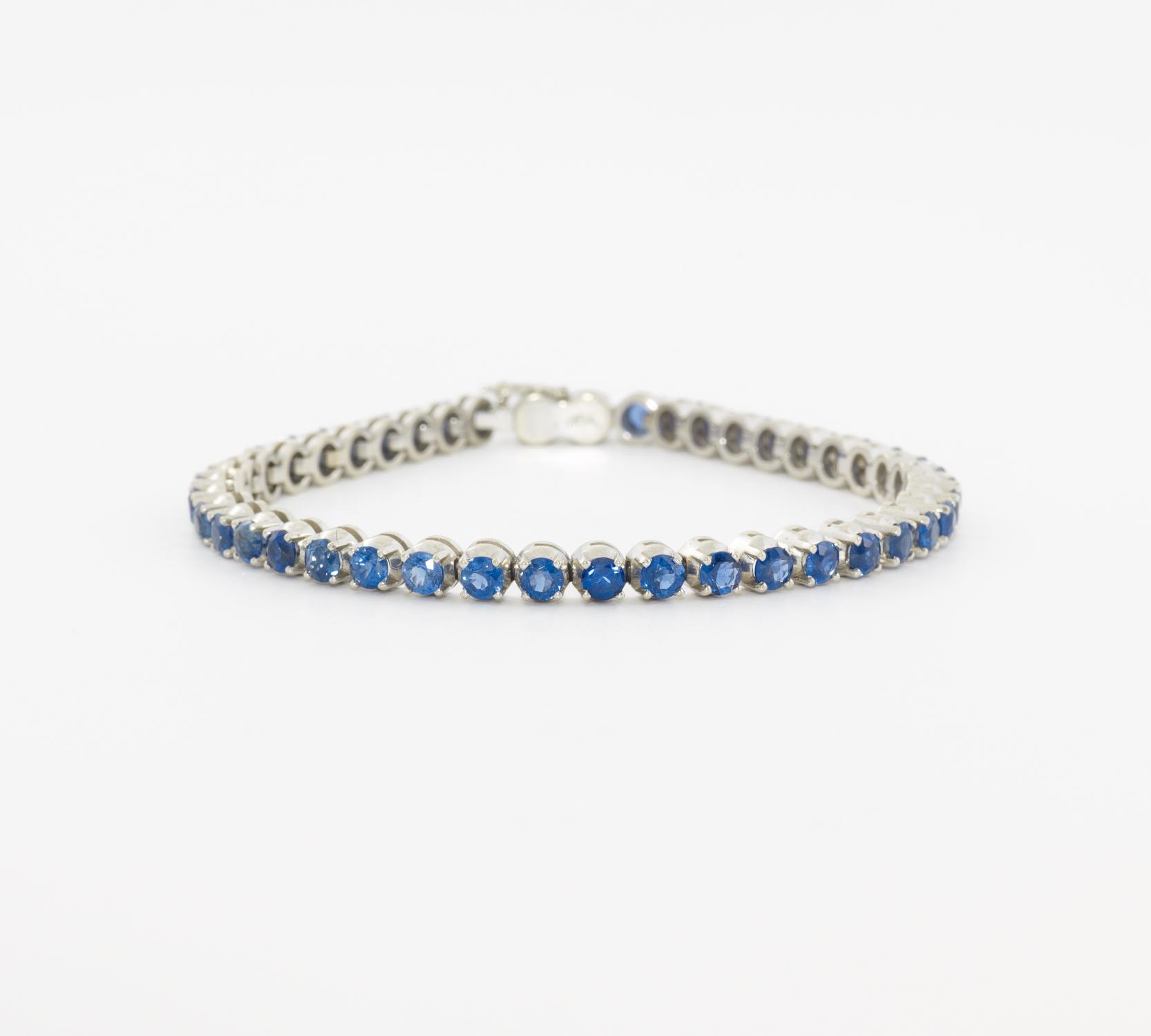 750/- Weißgold, Gewicht: 14,2g. 43 rund facettierte Saphire zus.ca. 6,45ct, feine Farbe, L x B=17,5 x 0,3cm.