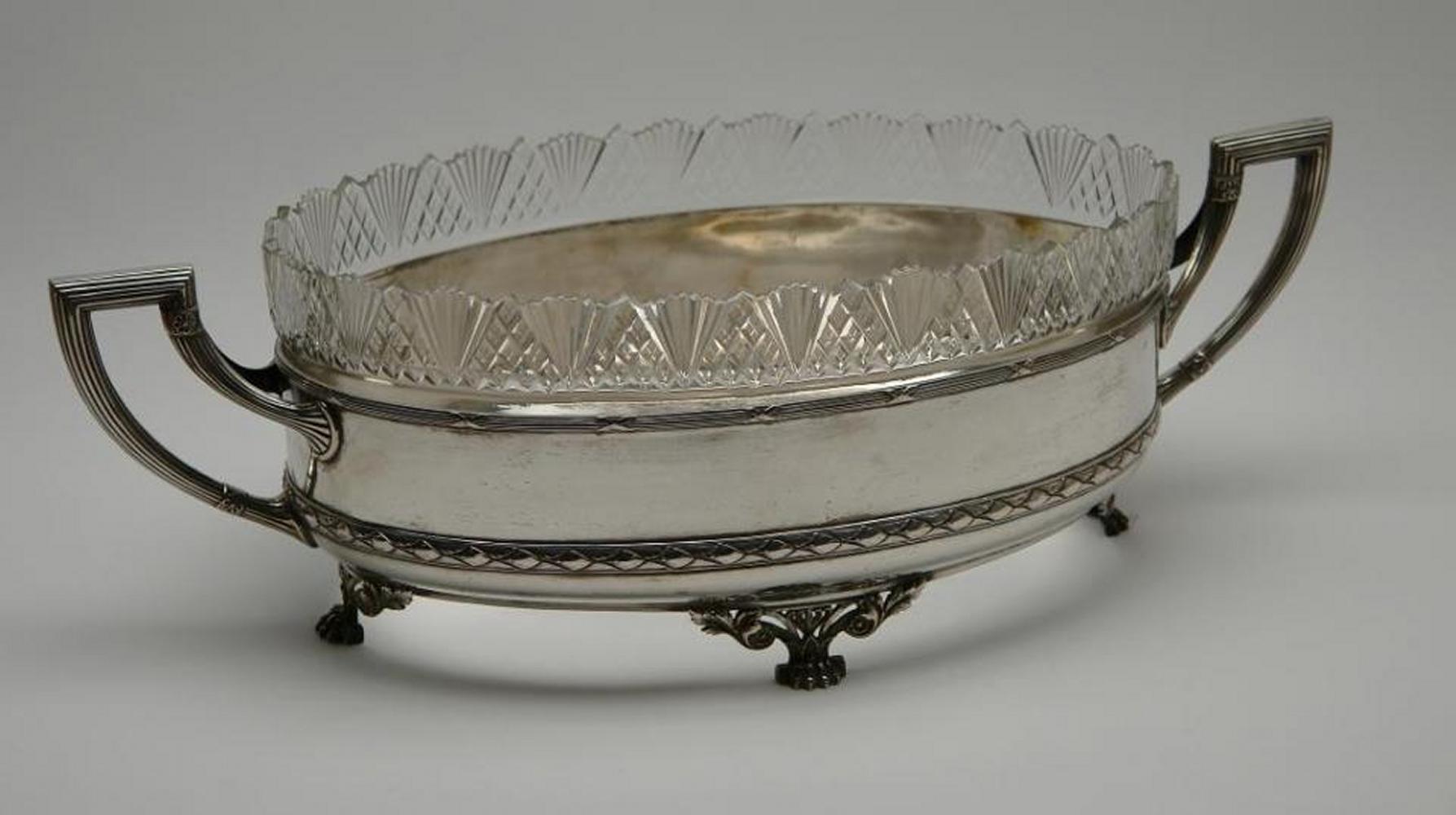 Silber mit Kristallglaseinsatz. Höhe 17,5cm, Länge 52cm. Ca. 1190g. Silber Zustand A. Glaseinsatz eine Zacke bestoßen.