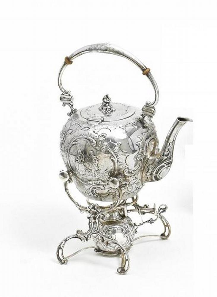 Silber. Gestell des Rechauds versilbert. In gegenständigen Rocaillekartuschen Kinderpaar bzw. höfisches Paar vor Landschaft. Höhe 37cm. Ca. 1630g. Zustand C.