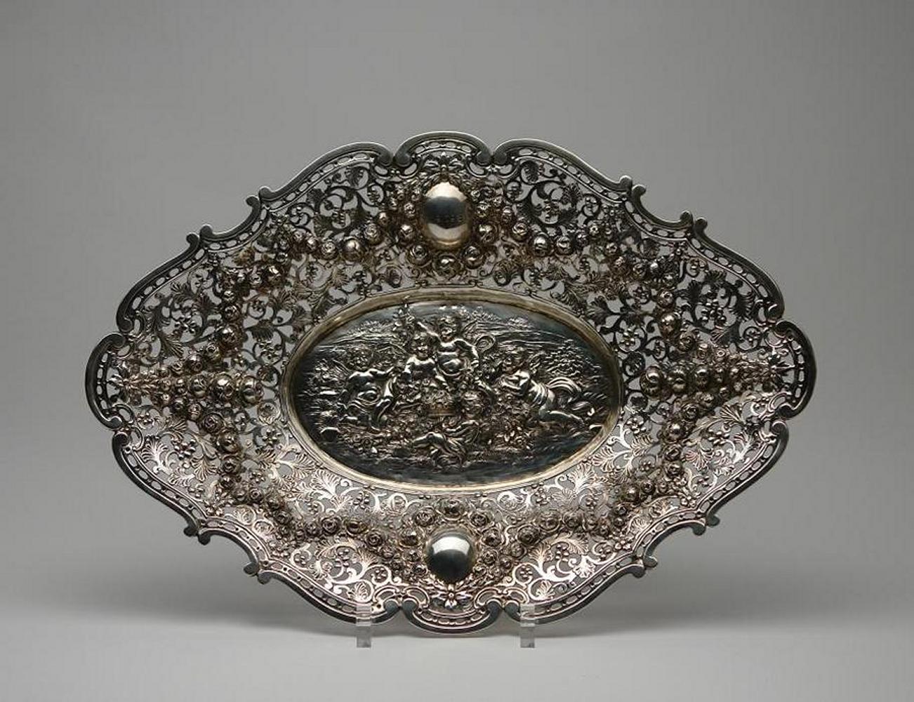 Silber. Durchbrochene Wandung mit Rosenfestons. Im Fond Amorettengruppe vor Landschaft. Höhe 8,5cm, Länge 52,5cm. Ca. 1160g. Zustand A.