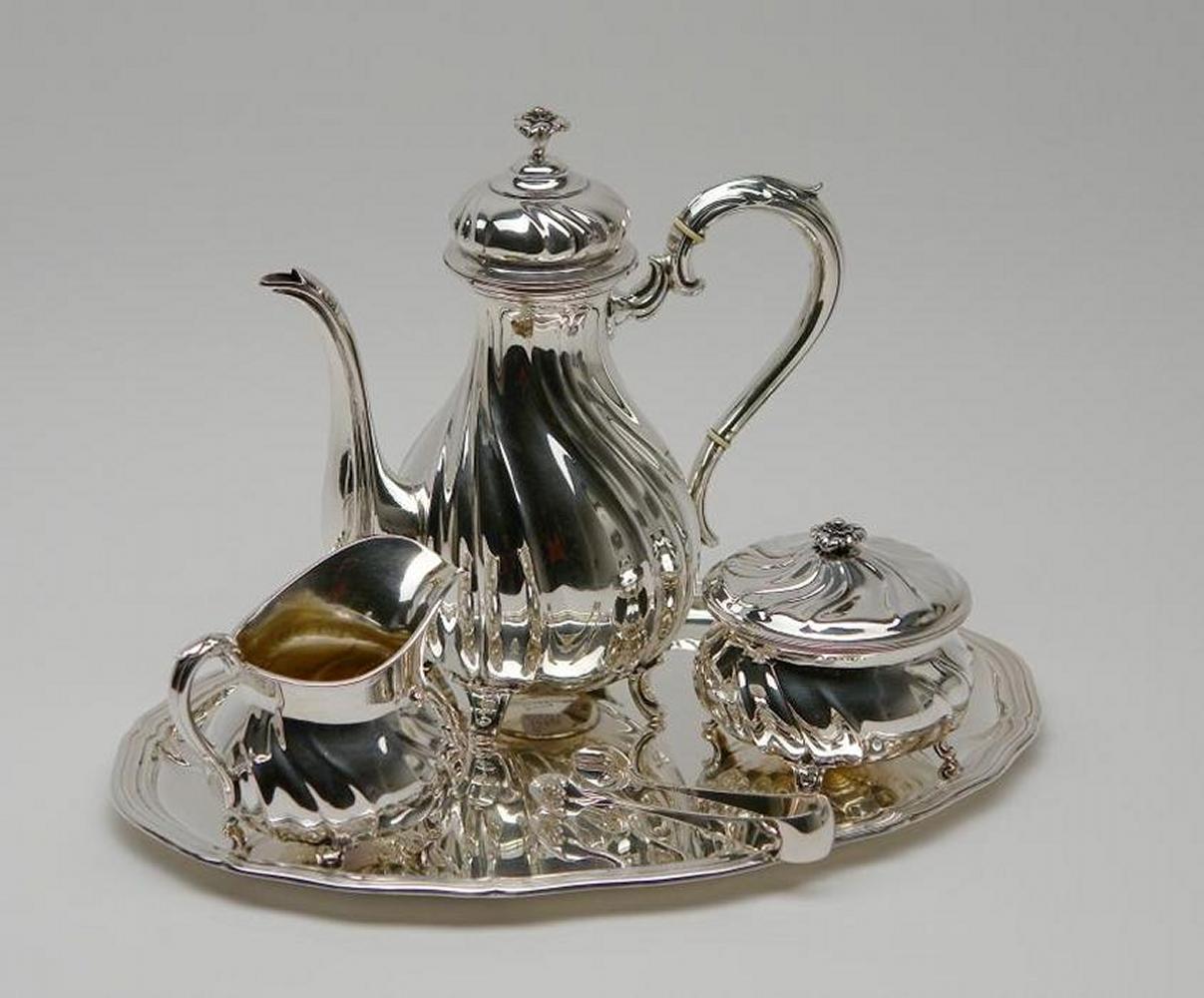 Silber, teilweise mit Innenvergoldung. Bestehend aus Kaffeekanne, Zuckerdose, Sahnekännchen. {Beil.:} Ovales Tablett. Schwäbisch