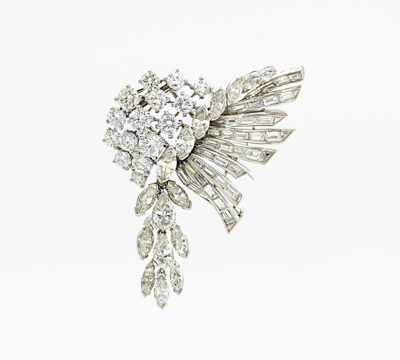 950/- Platin, 750/- Weißgold, Gewicht: 17,1g. 2 Diamant-Tropfen zus.ca. 0,712ct , 35 Diamant-Baguettes zus.ca. 1,05ct, 14 Diamant-Navettes zus.ca. 3,725ct, 15 Brillanten zus.ca. 2,554ct, TW-TCr(F-I) VVS, H x B=5,5 x 3,2cm. Ein Diamant-Baguette fehlend. Rückseitig punziert BN, das untere Element ist beweglich.