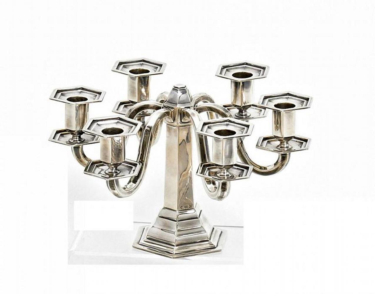Silber. Sechsseitiger, gestufter Fuß mit entsprechendem Schaft. Die sechs Leuchterarme tief