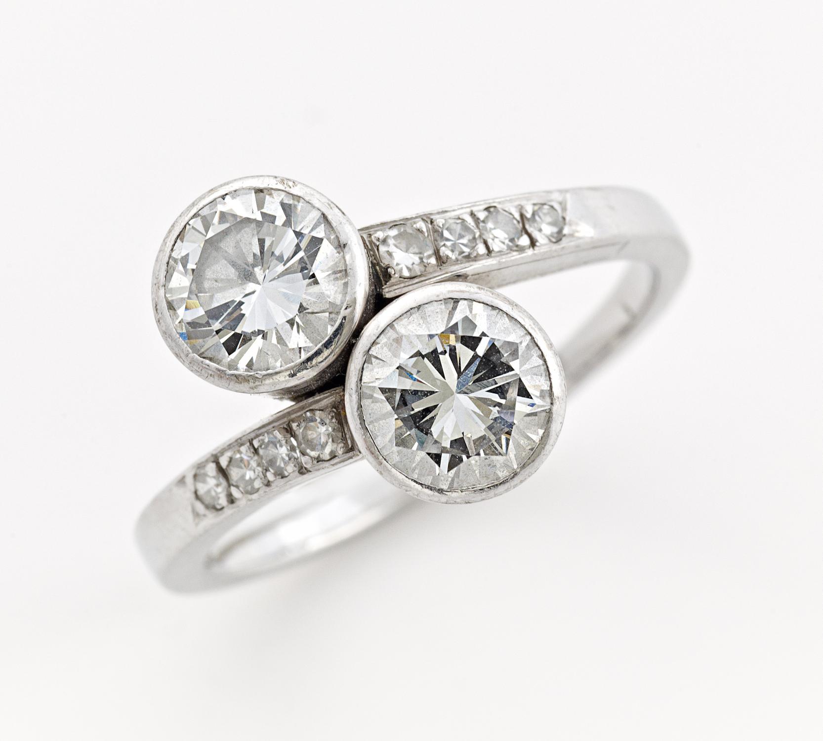 750/- Weißgold, Gewicht: 6,2g. 2 Brillanten zus.ca. 1,960ct TCr(I) VVS1-2, 8 winzige 8/8-Diamanten, EU-RM: 60.