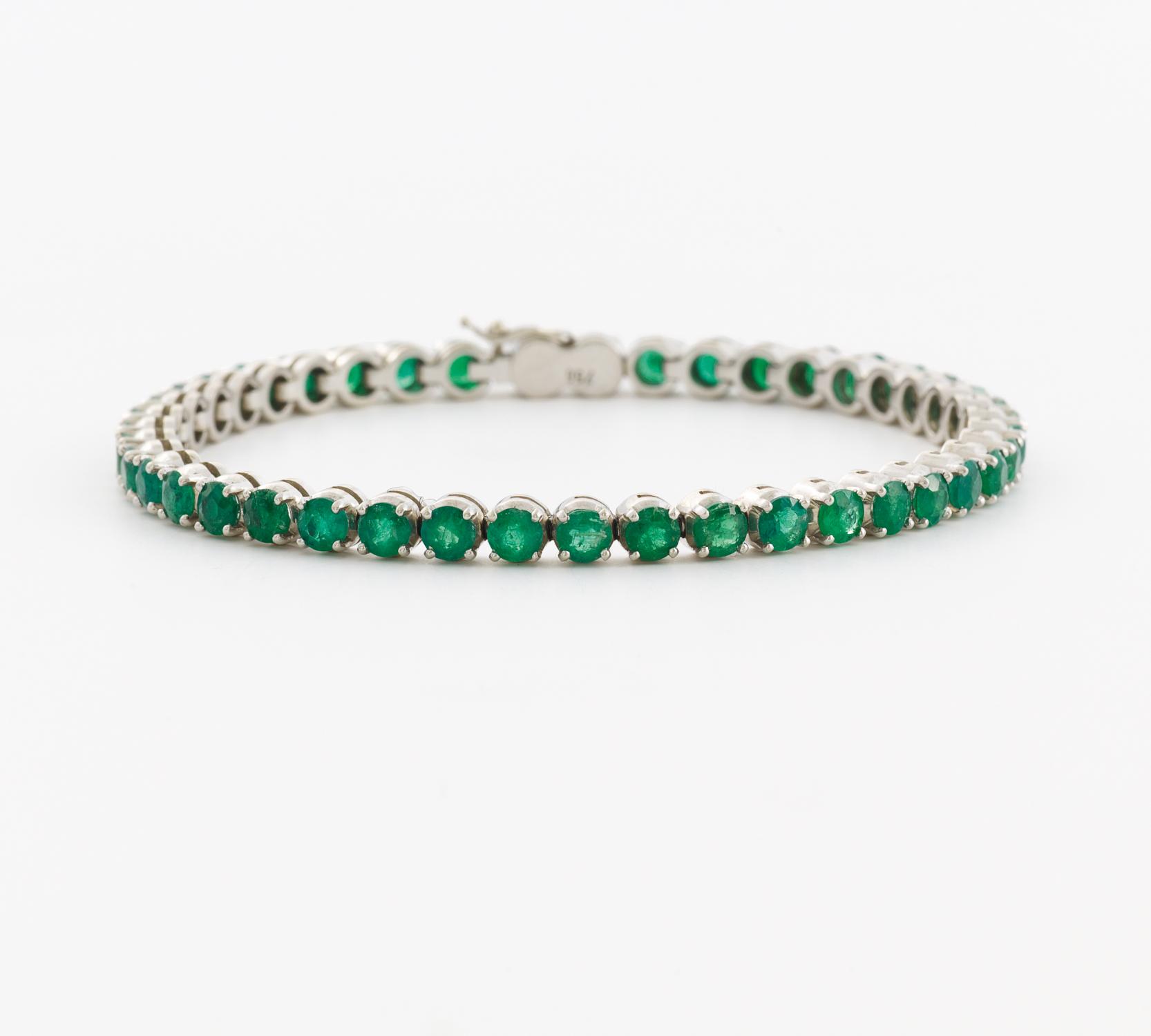 750/- Weißgold, Gewicht: 14,5g. 43 rund facettierte Smaragde zus.ca. 6,02ct, L x B=17,5 x 0,3cm. Zarte Abplatzungen an drei Smaragden.