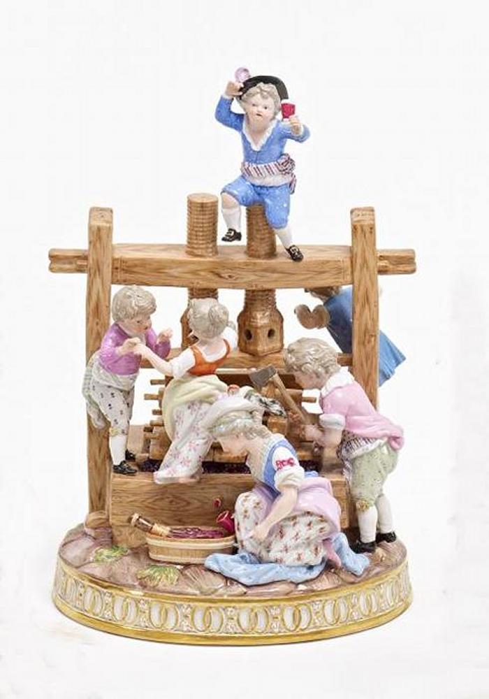 Porzellan, farbig und gold staffiert. Auf großem Rundsockel Winzerkinder beim Trauben pressen. Von Winzerjungen mit Weinglas in