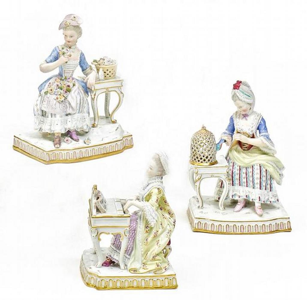 Porzellan, farbig und gold staffiert. Je eine höfische Dame an einem Tisch sitzend, mit entsprechenden Attributen einen Sinn