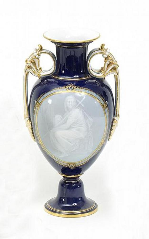 Porzellan, kobaltblau und gold staffiert. Pate-sur-Pate-Technik. Auf kobaltblauem Fond gold und türkis umrandete Reserve mit Darstellung der Hl. Helena.