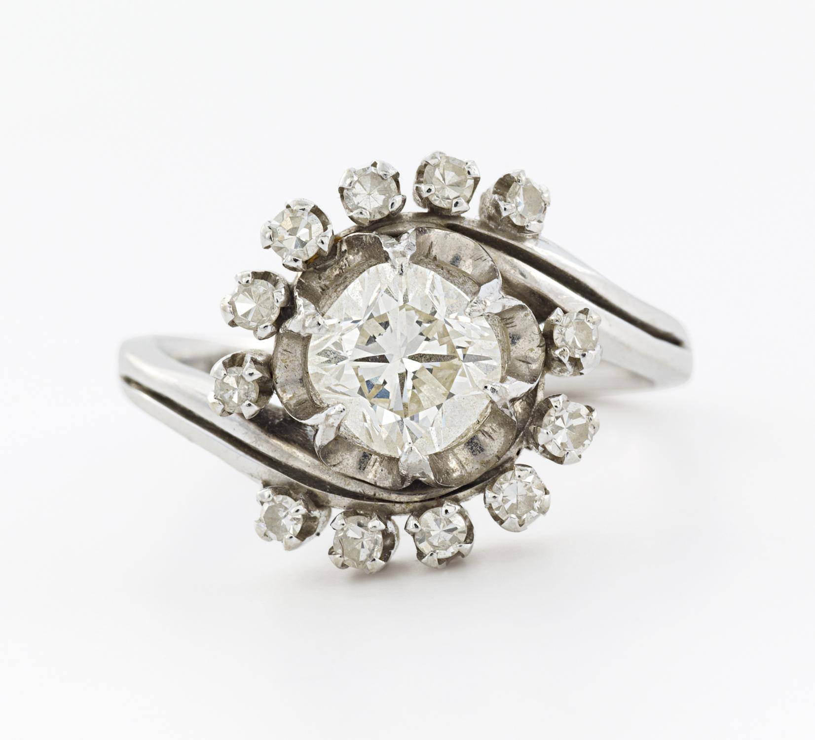 585/- Weißgold, Gewicht: 4,8g. 1 Diamant im Cushion Cut ca. 0,91ct TCr(I) VS1, 12 8/8-Diamanten zus.ca. 0,144ct, EU-RM: 53. Ringtop: D.ca. 1,4cm.