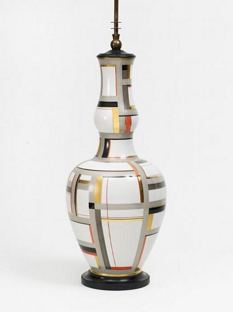 Porzellan, farbig und gold staffiert. Doppelkürbisflasche mit geometrischem Gitterwerk. Höhe 132cm. Zustand A/B. Elektrifiziert. Dreiflammig.