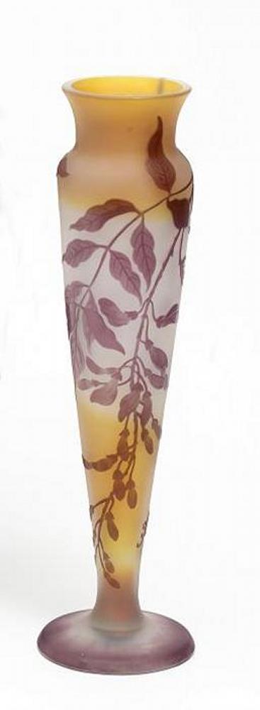 Farbloses Glas, milchig weiß und gelb hinterfangen. Überfang in Violett. Mattgeätztes und glänzendes florales Dekor auf mattem Grund. Höhe 41cm. Zustand A.