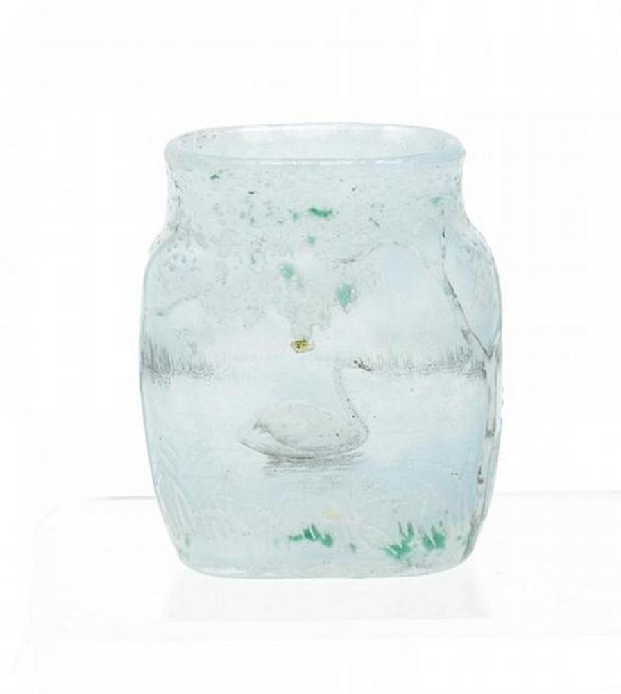 Farbloses Glas, hellblau hinterfangen. Überfang in Weiß, Grün und Schwarz. Geätzt und emailbemalt. Schwäne auf einem Teich umringt von Birken. Höhe 9cm. Zustand A/B.