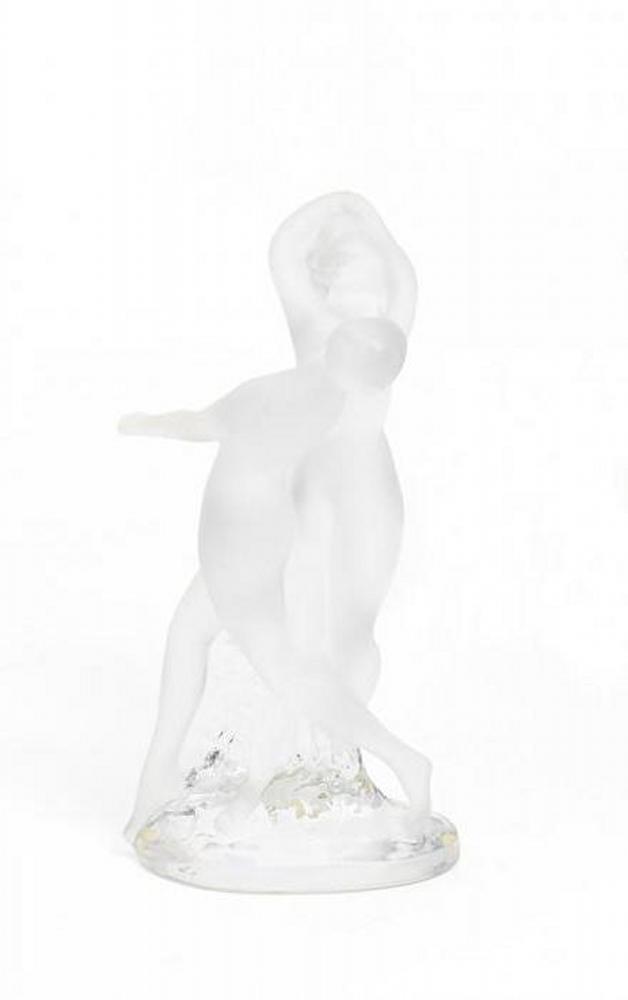 Farbloses Pressglas, tlw. mattiert. Über ovalem Fuß zwei miteinander tanzende Akte. Höhe 25cm. Zustand A.