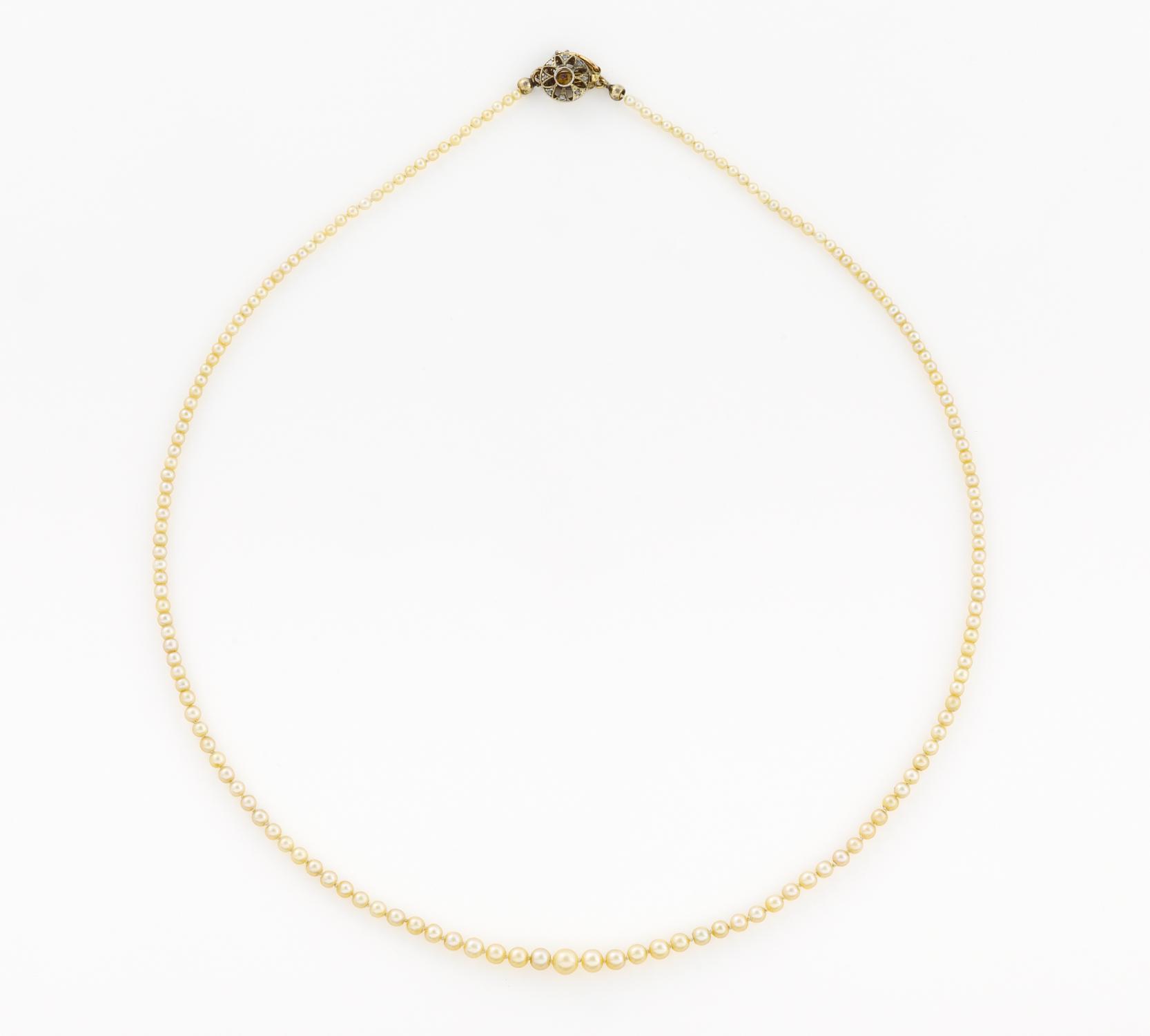 Zierschloß: 585/- Gelbgold, Silberverbödung, 8 winzige Diamantrosen, mittlerer Stein fehlend, Gewicht: 3,7g. 170 verlaufende Naturperlen, oval, rundlich-rund, D. 1,65-1,70 und 3,95-4,0mm, crème,