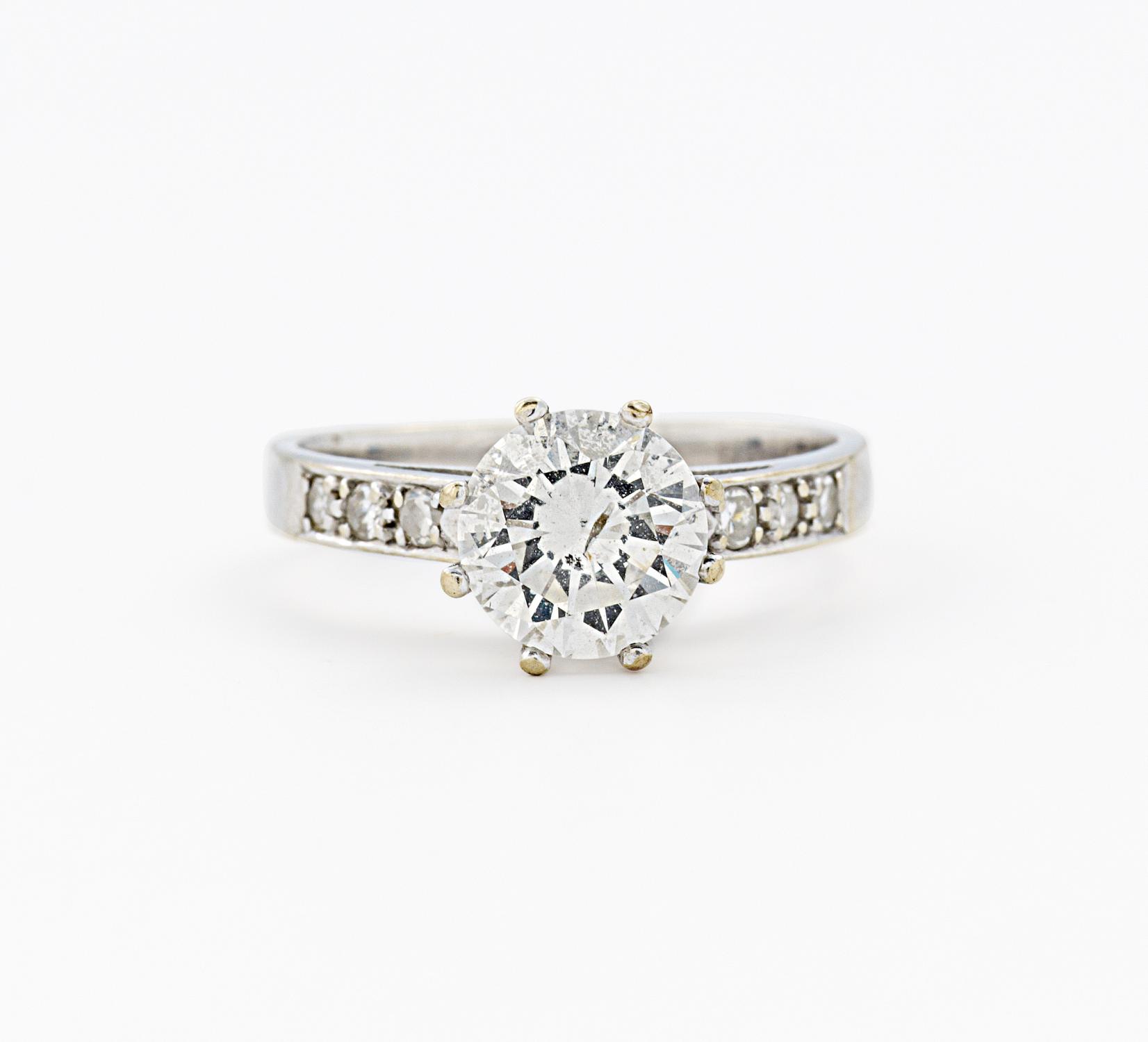 585/- Weißgold, Gewicht: 3,2g. Brillant ca. 1,381ct W(H) P2, 6 winzige 8/8-Diamanten, EU-RM: 50.