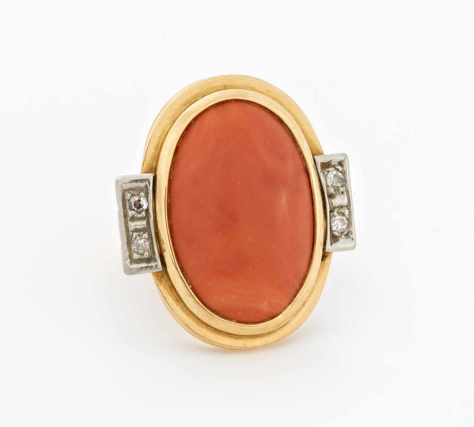 585/- Gelb-/Weißgold, Gewicht: 11,2g. 4 winzige Diamanten im Alt-/8/8-Schliff zus.ca. 0,132ct, 1 ovaler Korall-Cabochon (Mittelmeer) ca. 9,0ct,