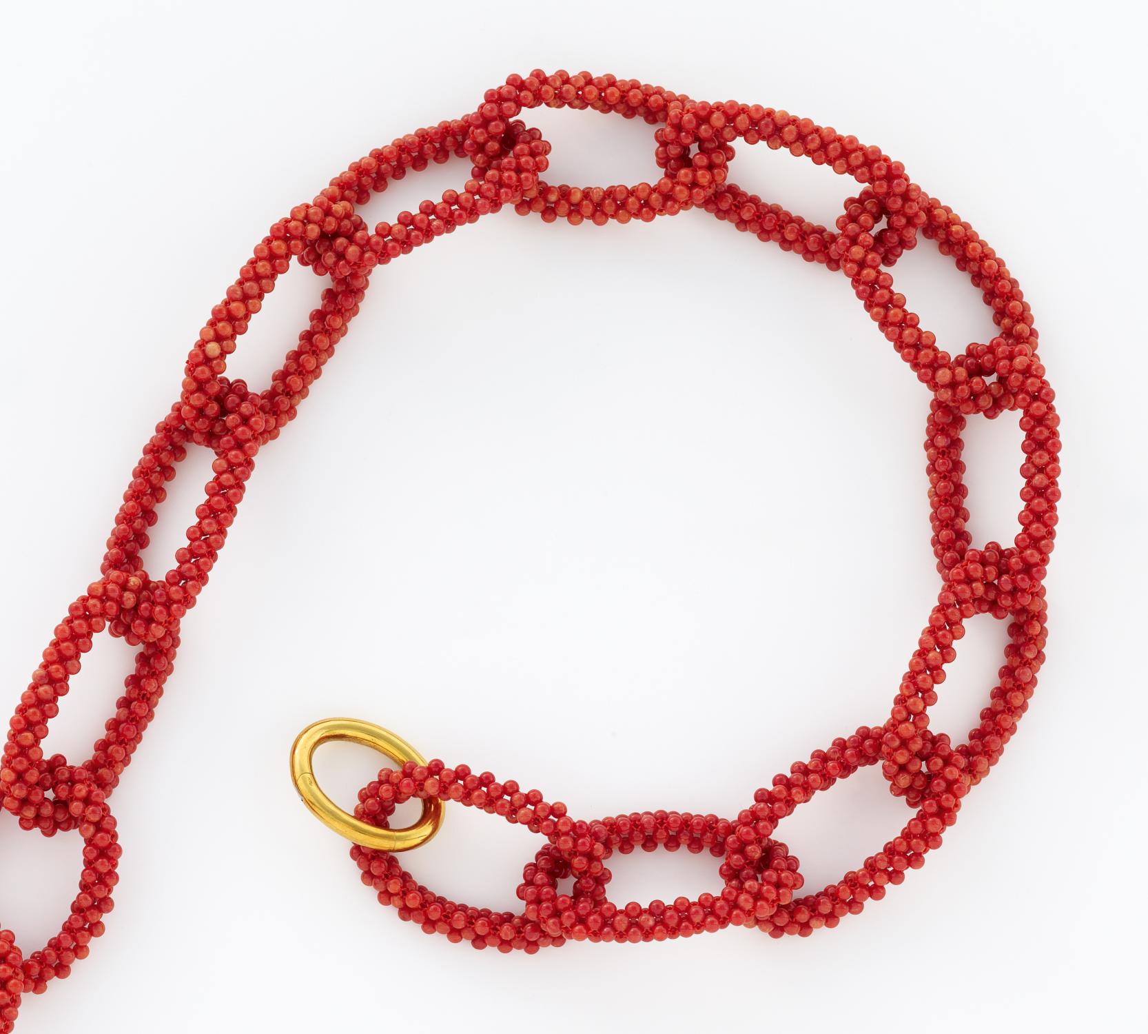 Verschluß: 925/- Silber, vergoldet, Gewicht: 122,2g. Vielzählige aufgefädelte rote Korallperlen (Mittelmeer), D. 2,82mm,