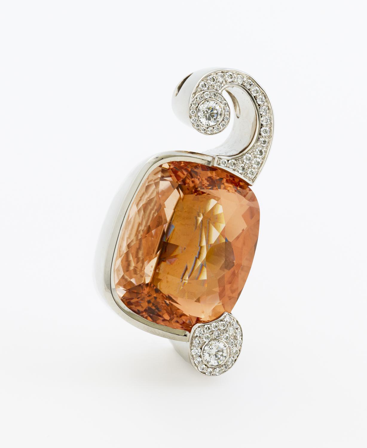 750/- Weißgold, Gewicht: 115,2g. 1 lachs-rosafarbener Morganit im Ceylon-Schliff (Kissenform) ca. 33,45x28,60x21,70mm, ca. 163,0ct, 63 Brillanten zus.ca. 1,691ct TW(G) VVS, H x B=ca. 5,8 x 3,1cm. Der Morganit ist eine Varietät des Berylls, zu dem u.a. auch Smaragd und Aquamarin