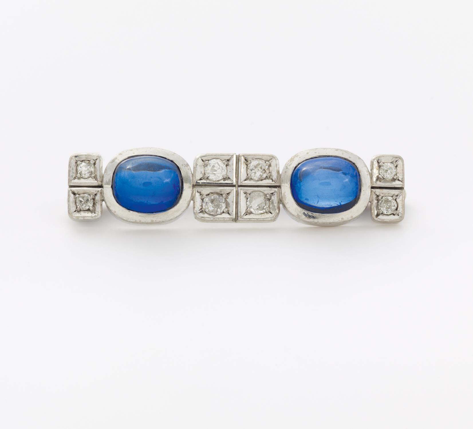 590/- Weißgold, Gewicht: 8,0g. 2 oval synthetische Saphir-Cabochons zus.ca. 4,18ct, 8 winzige Altschliff-Diamanten zus.ca. 0,285ct, H x B=1,3 x 4,0cm.