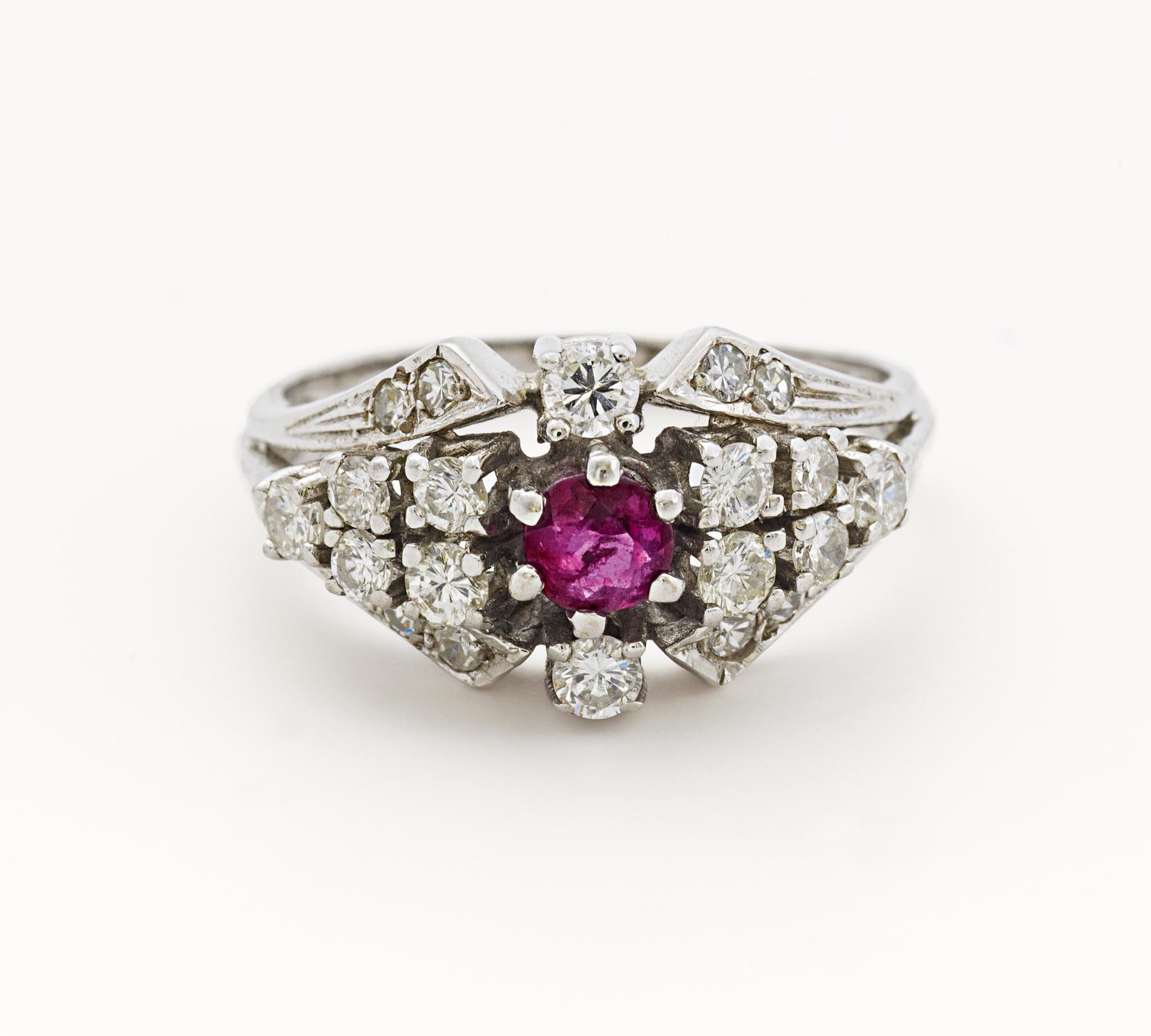 585/- Weißgold, Gewicht: 5,2g. 1 rund facettierter Rubin ca. 0,35ct, 12 Brillanten und 8 8/8-Diamanten zus.ca. 0,628ct W(H) VS, EU-RM: 58.