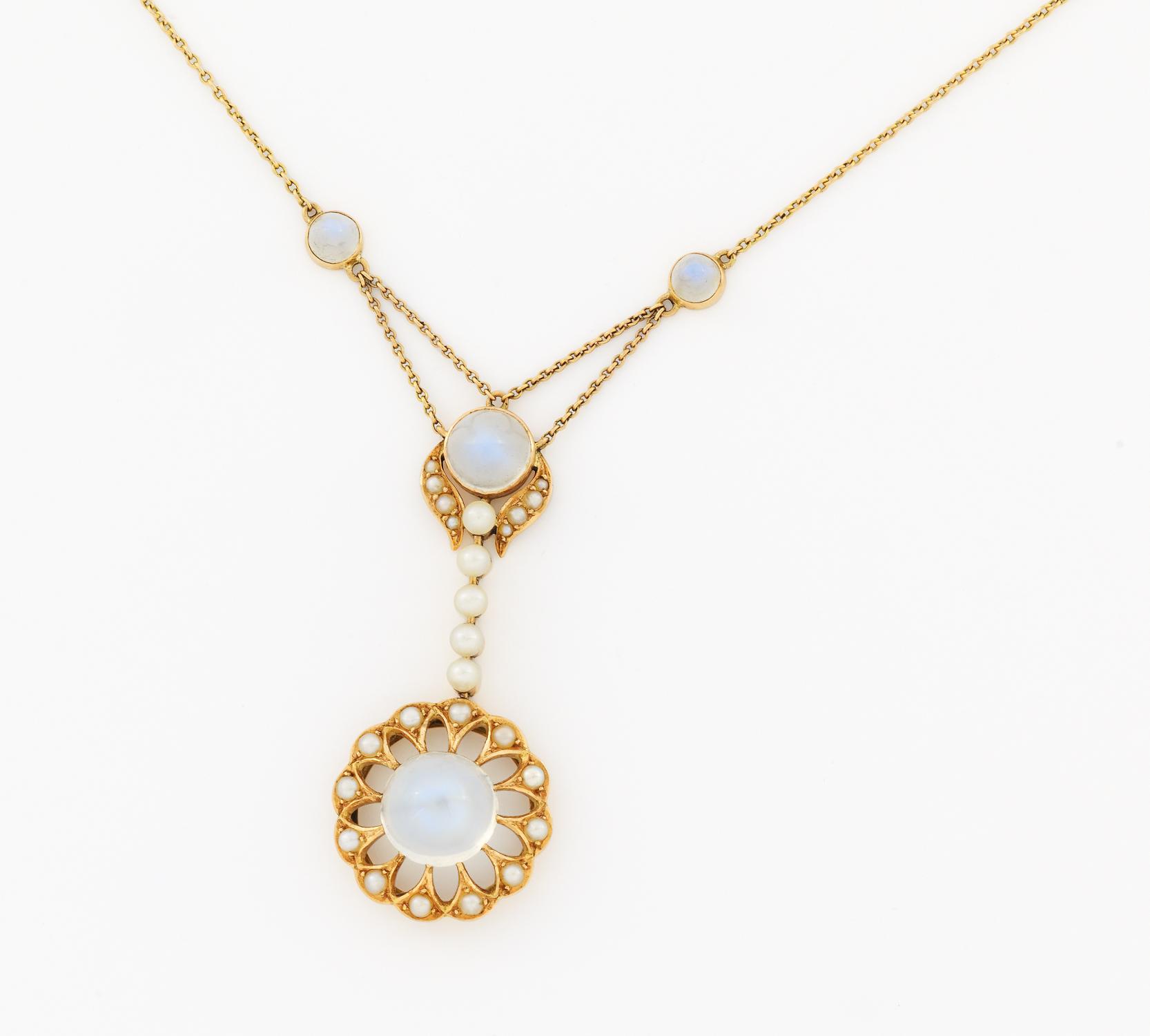 Jugendstil. Anhängerkette mit Mondstein-Zuchtperlbesatz.